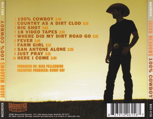 Jason Meadows was the first runner-up on season three of USA Networks "Nashville Star". On Jasons debut release his single 100% Cowboy is being used as the theme song for the CMT series "Americas Top Cowboy. This stellar album also features guest performances by Vince Gill, The Jordanaires, The Pearls of Joy, and Charity Von.Additional Info: Personnel: Jason Meadows (harmonica); Jason Meadows; Charity Von (vocals, background vocals); Nick Pellegrino (acoustic guitar, electric guitar, percussion, background vocals); Brent Mason (electric guitar); Aubrey Hainey (fiddle); Michael Webb (keyboards); Rob Harrington (bass guitar); Chraig Wright, Craig Wright (drums); The Pearls Of Joy, Nick Pellegrino (background vocals); Billy Panda (acoustic guitar, mandolin); Johnny Hiland (electric guitar); Mike Daly (slide guitar, steel guitar); Ilya Toshinsky (banjo); Chris Carmichael (strings); Tim Akers (keyboards); Mike Brignardello (bass guitar); Eric Darken (percussion); The Jordanaires, Vince Gill (background vocals).
