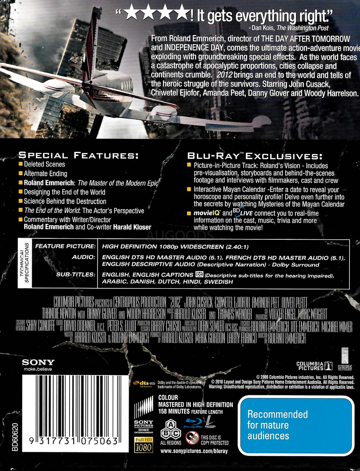 From Roland Emmerich, director of The Day After Tommorrow and Independence Day, comes the ultimate action-adventure film, exploding with groundbreaking special effects. As the world faces a catastrophe of apocalyptic proportions, cities collapse and continents crumble. 2012 brings an end to the world and tells of the heroic struggle of the survivors. Starring John Cusack, Chiwetel Ejiofor, Amanda Peet, Woody Harrelson and Danny Glover.
