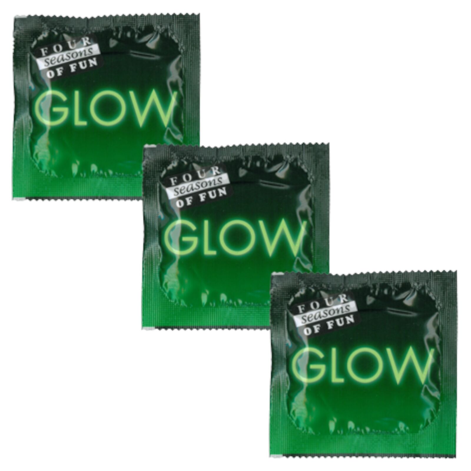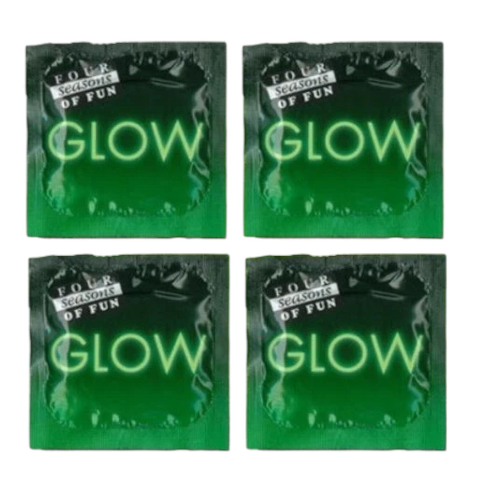 This listing includes 48 Glow N Dark condom sachets from Four Seasons, each designed to glow after exposure to bright light.