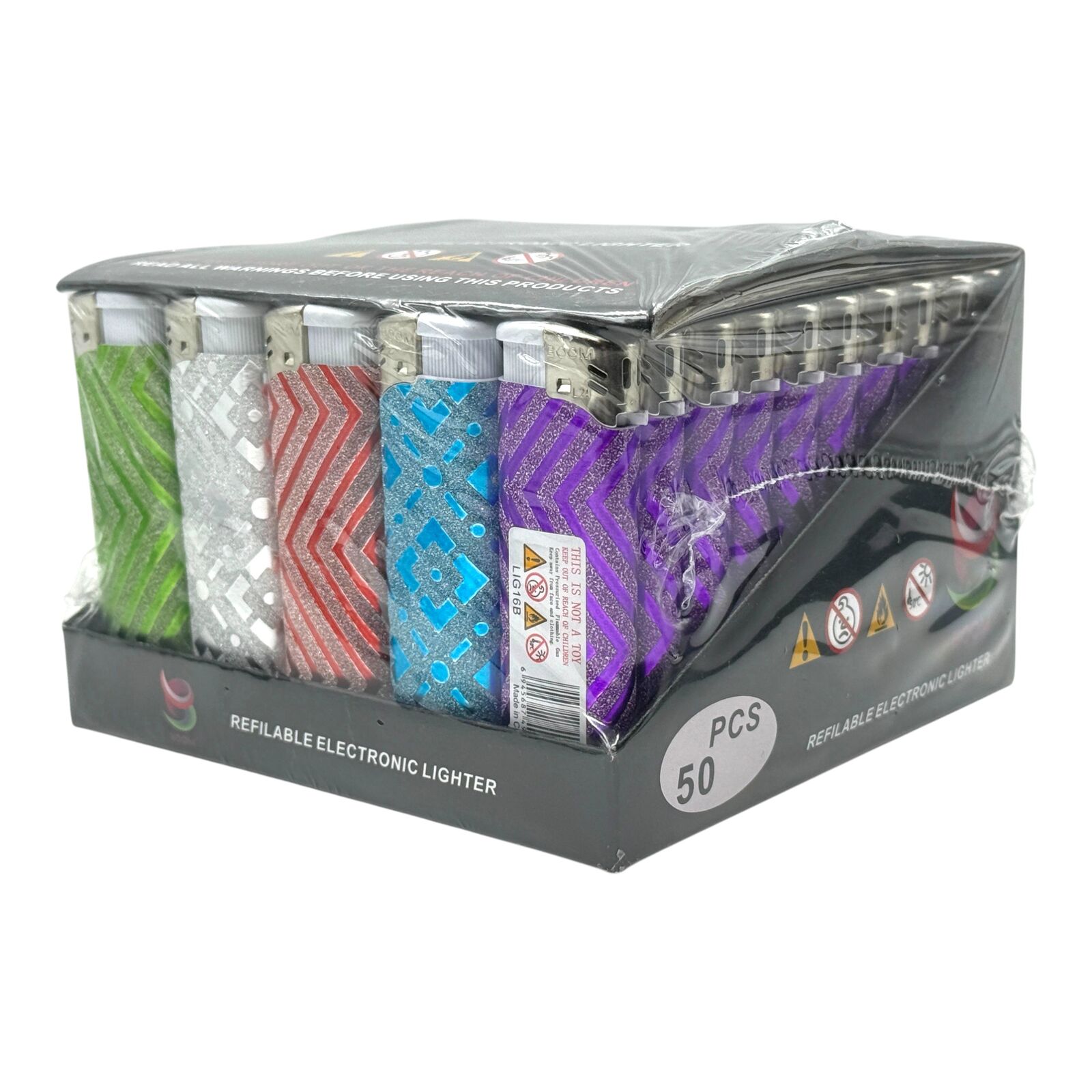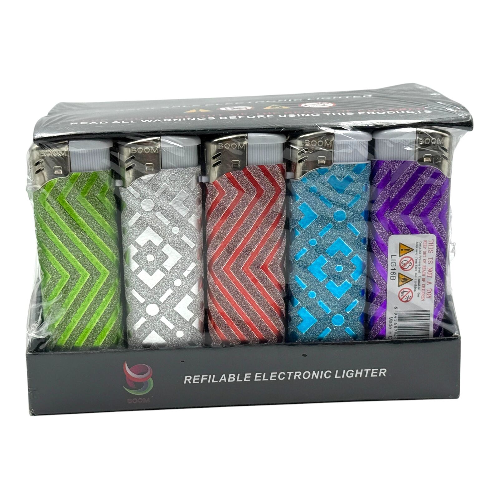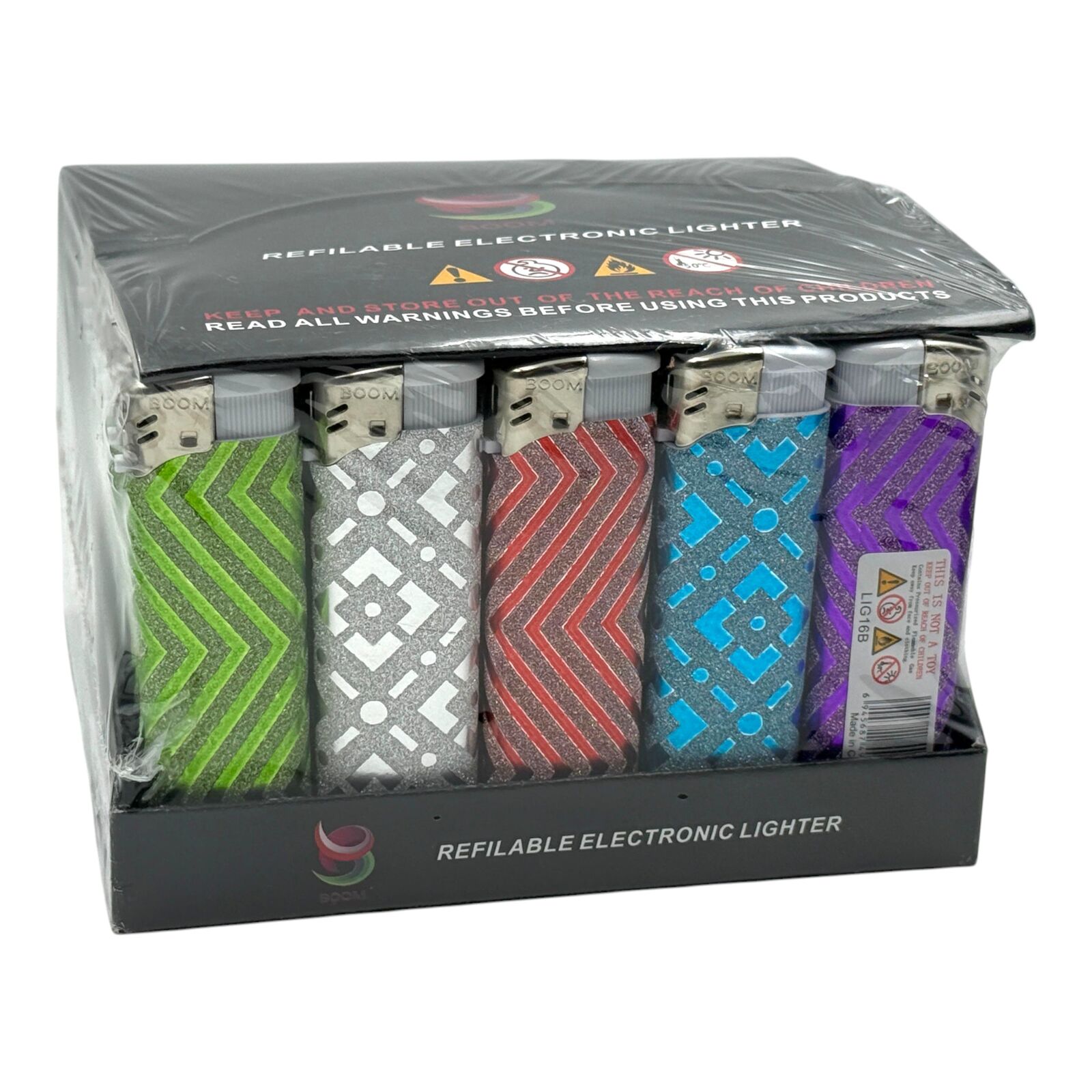 This box of 50 Boom gas lighters is supplied as a full tray and features a distinctive glitter zig zag patterned wrap in assorted colours throughout. These are click ignition lighters, offering straightforward and reliable operation for everyday lighting needs. Supplied in a display style tray, they are suitable for personal use, retail counters, or general stock.
