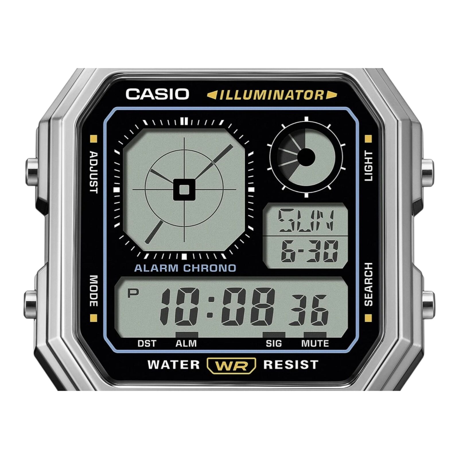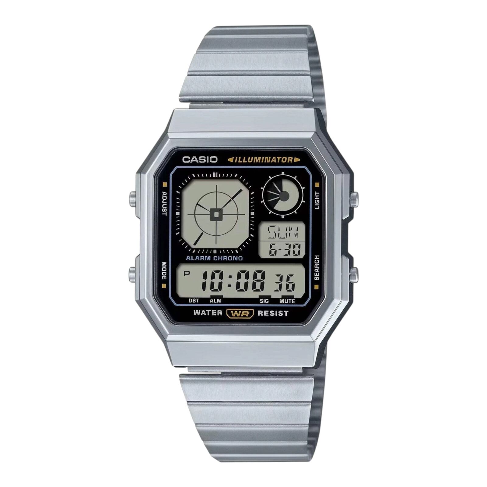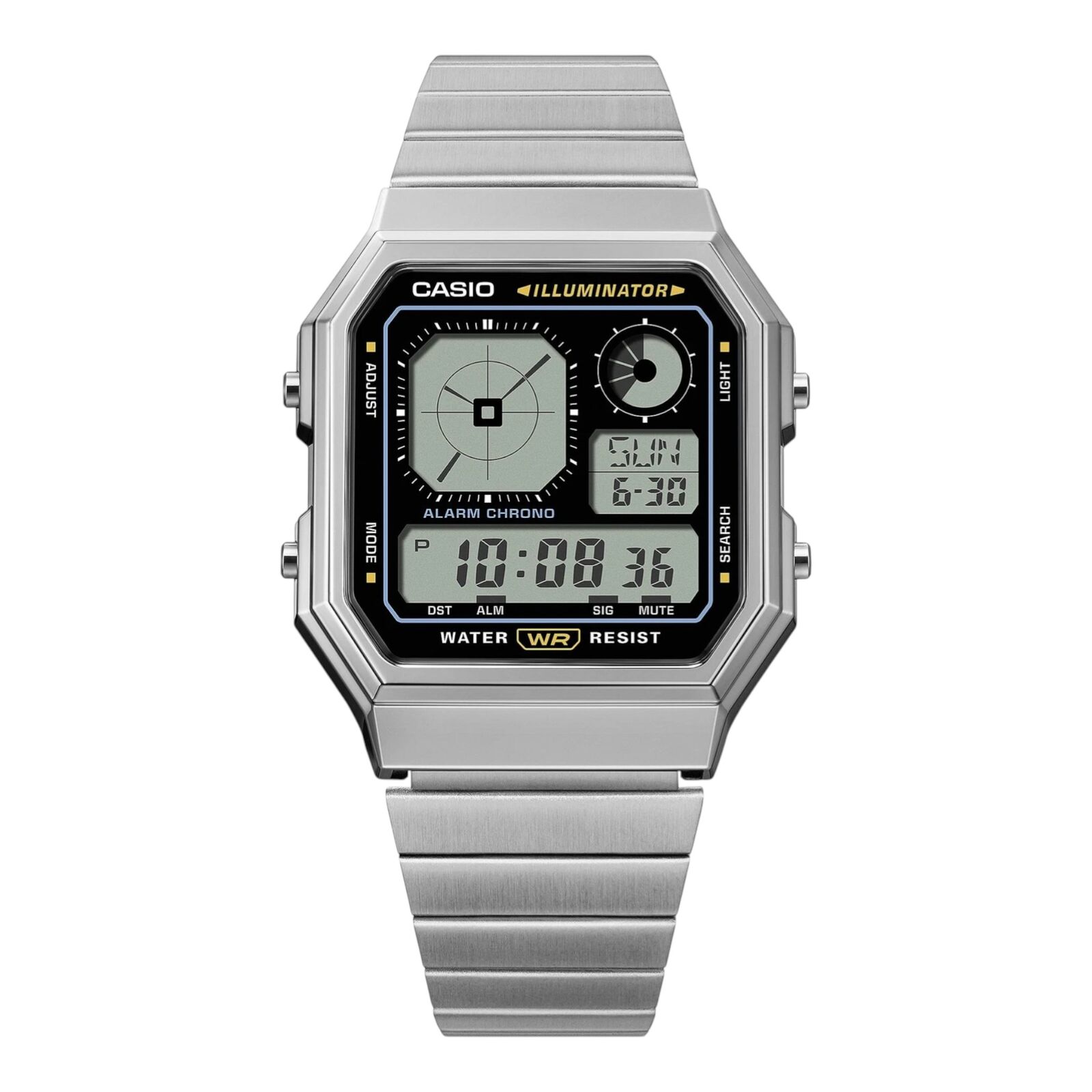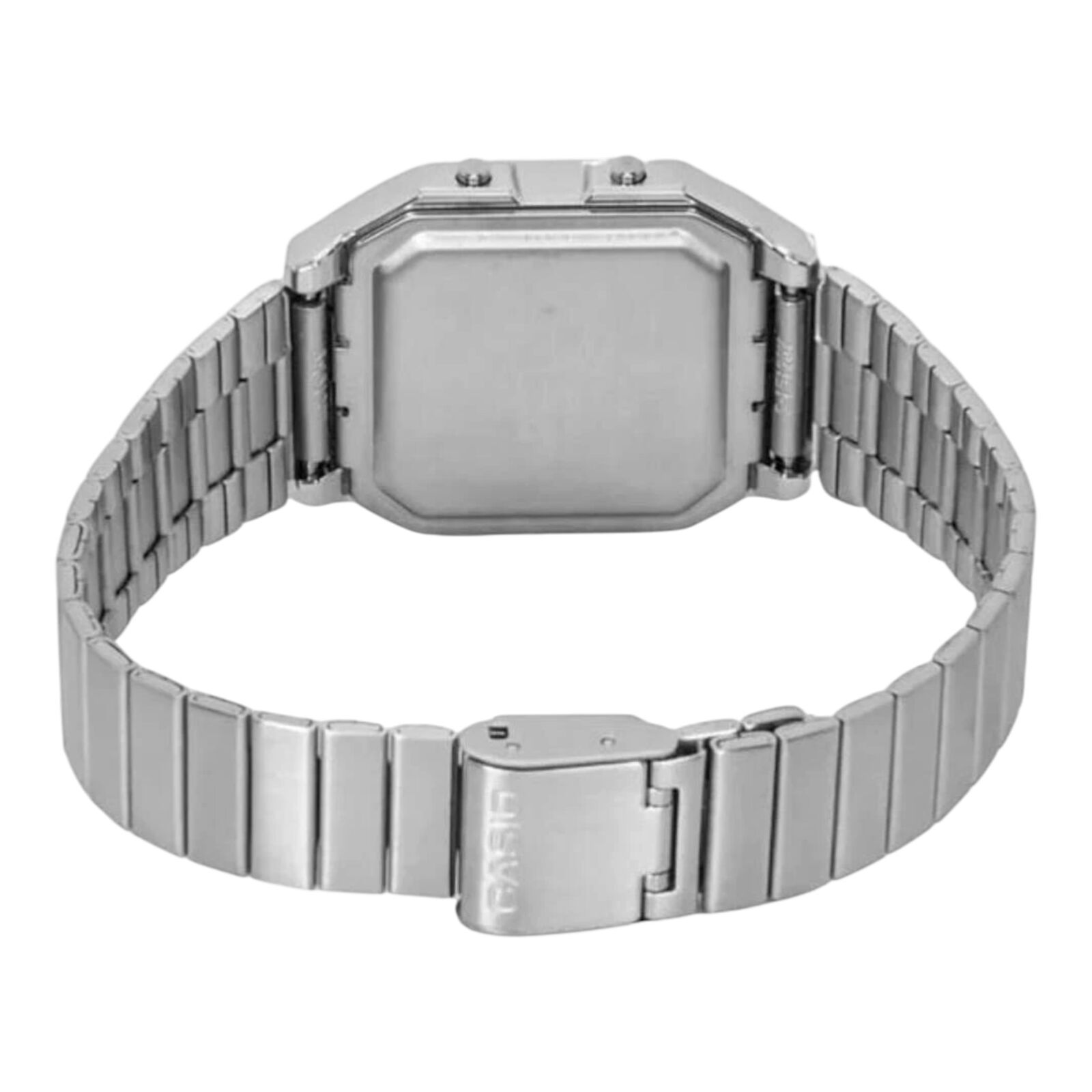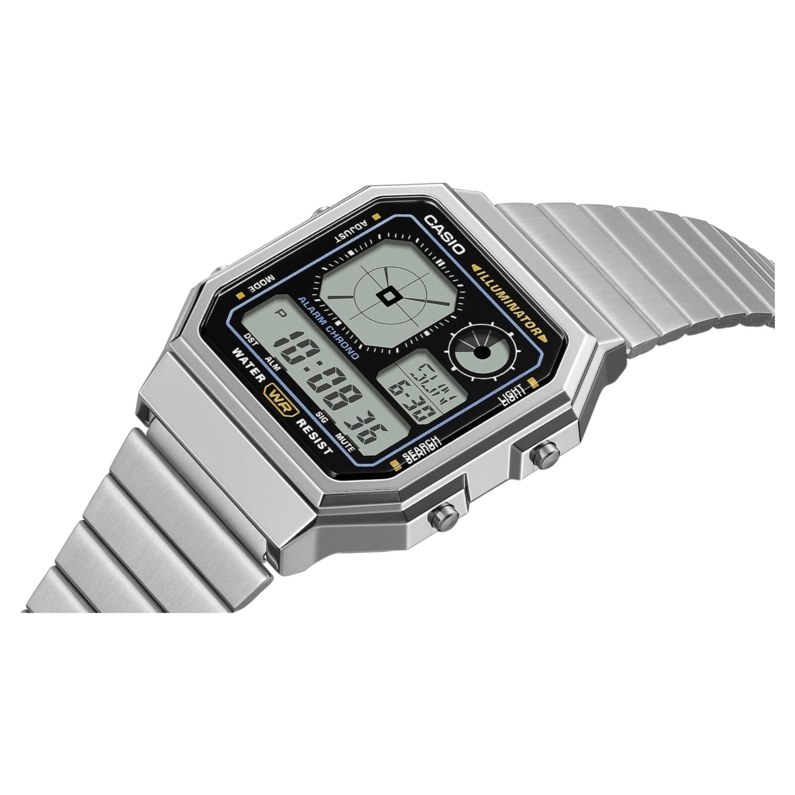 The Casio A130WE-1A combines retro digital styling with practical everyday functionality. Its unique analog-style digital display and chrome-toned case create a gadget-inspired look, paired with a stainless steel bracelet for classic Casio durability.