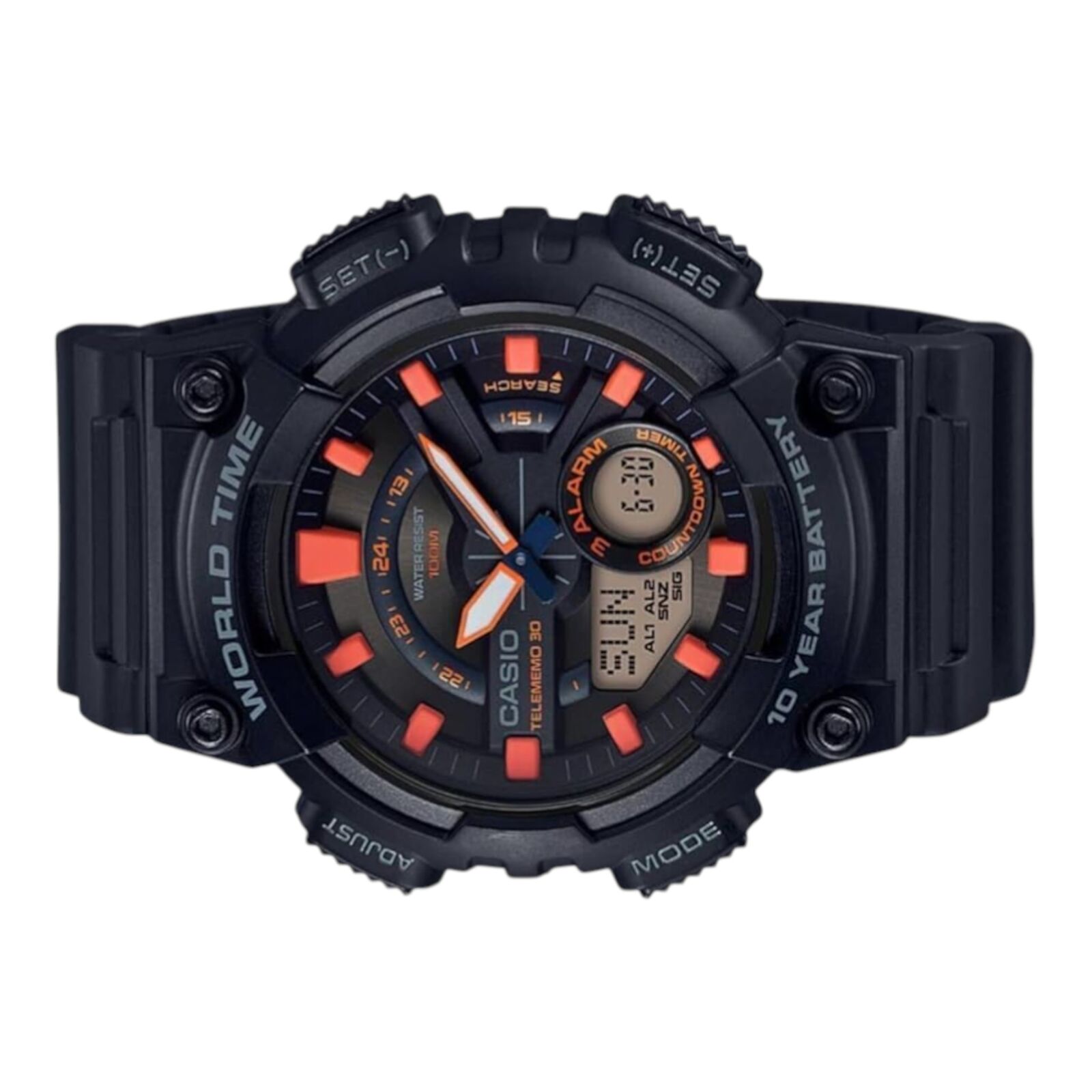 The Casio AEQ-110W-1A2V features a bold analog digital design with a layered 3D dial and high contrast display. Built for everyday functionality, this model combines durable construction with practical features suited for daily use.