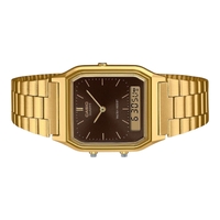 A retro inspired design with modern functionality, the Casio AQ-230GA-5A features a brown sunray dial paired with a gold tone stainless steel band. Combining analog timekeeping with a digital display, this model offers a versatile look suited for both casual and dress wear.