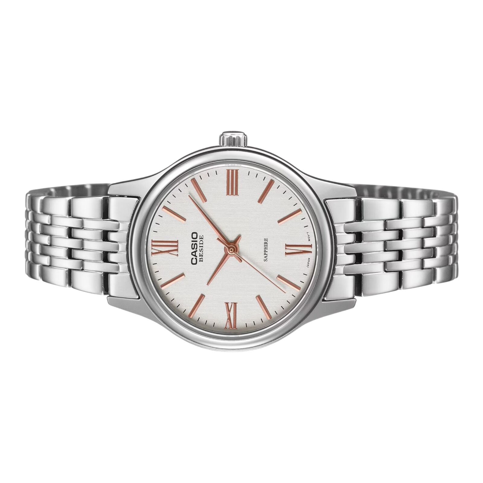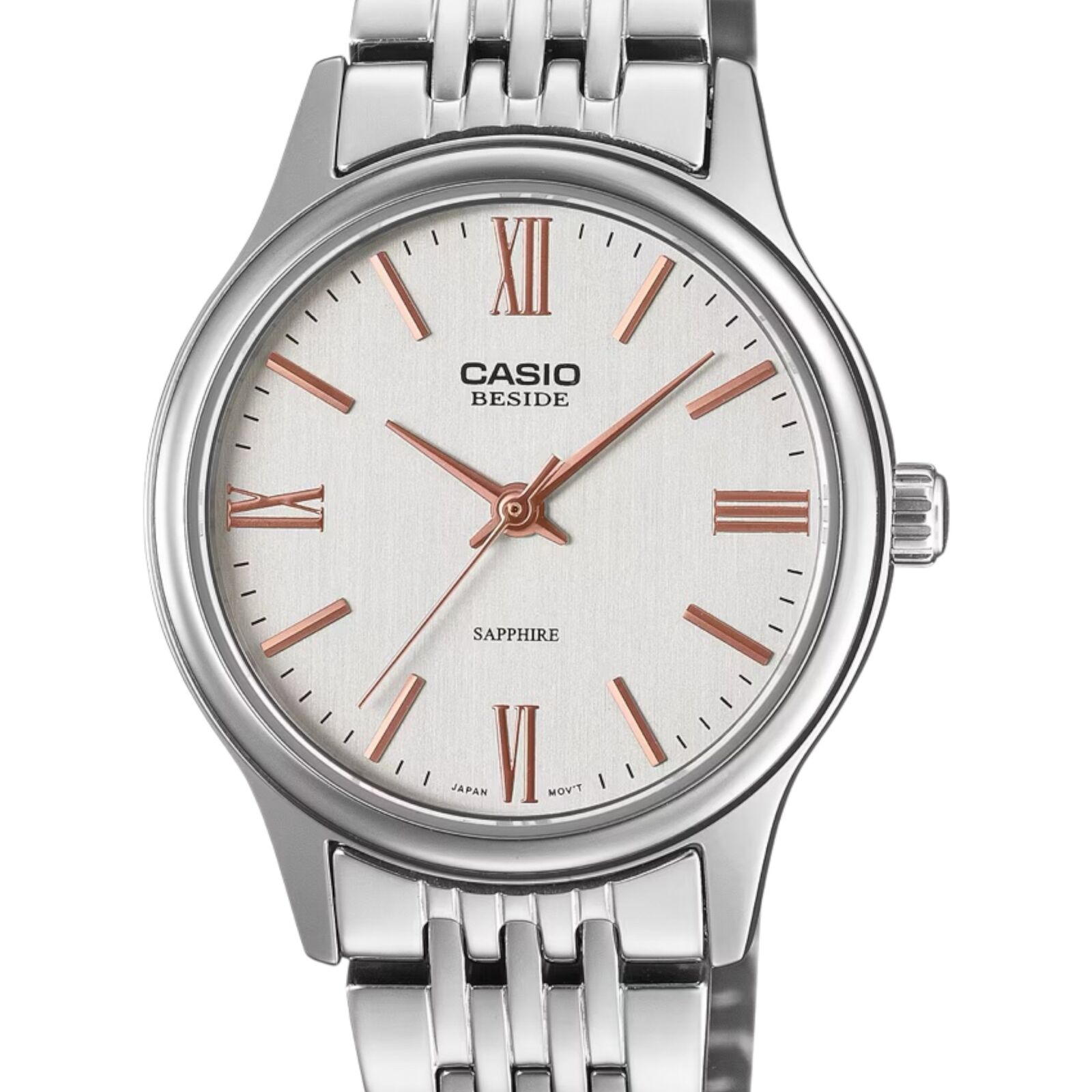 The Casio BLS-100D-7AV from the Beside series delivers refined elegance in a compact stainless steel design. Featuring a clean silver dial and solid stainless steel bracelet, this timepiece offers a sophisticated look suited to professional and formal settings.