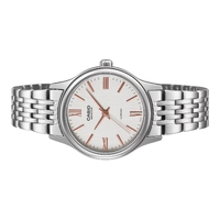 Silver dial display. Classic analog layout with 3 hands for simple and elegant timekeeping.