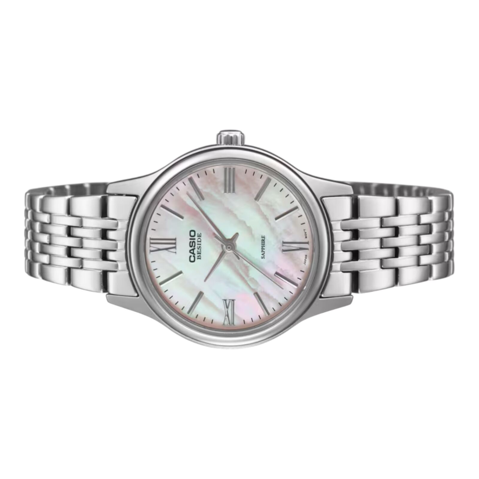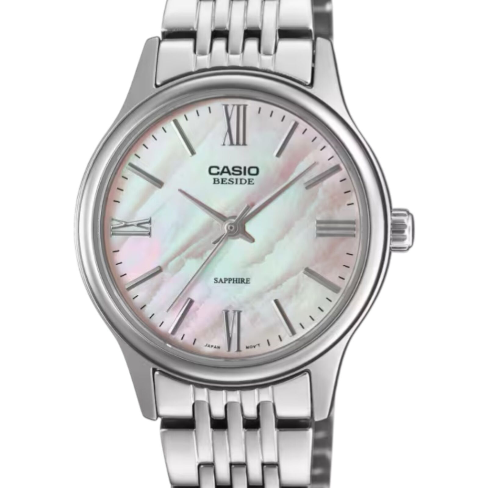 The Casio BLS-100DS-4AV from the Beside series delivers refined elegance in a compact stainless steel design. Featuring a mother of pearl dial and solid stainless steel bracelet, this timepiece offers a sophisticated look suited to both professional and formal settings.