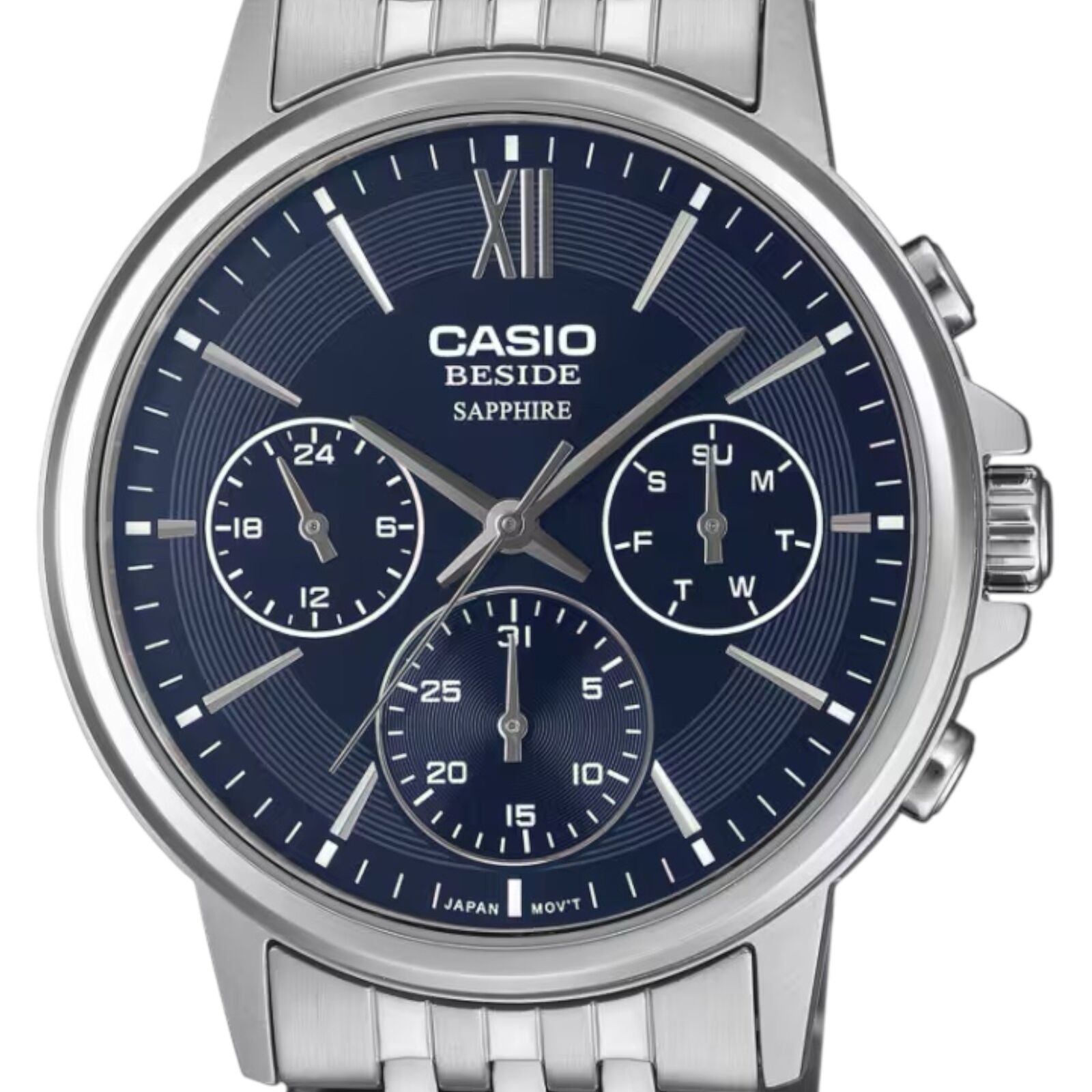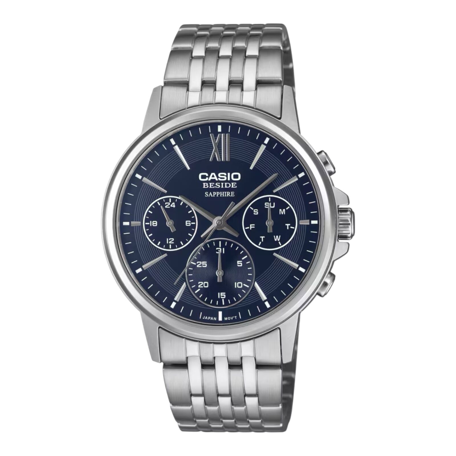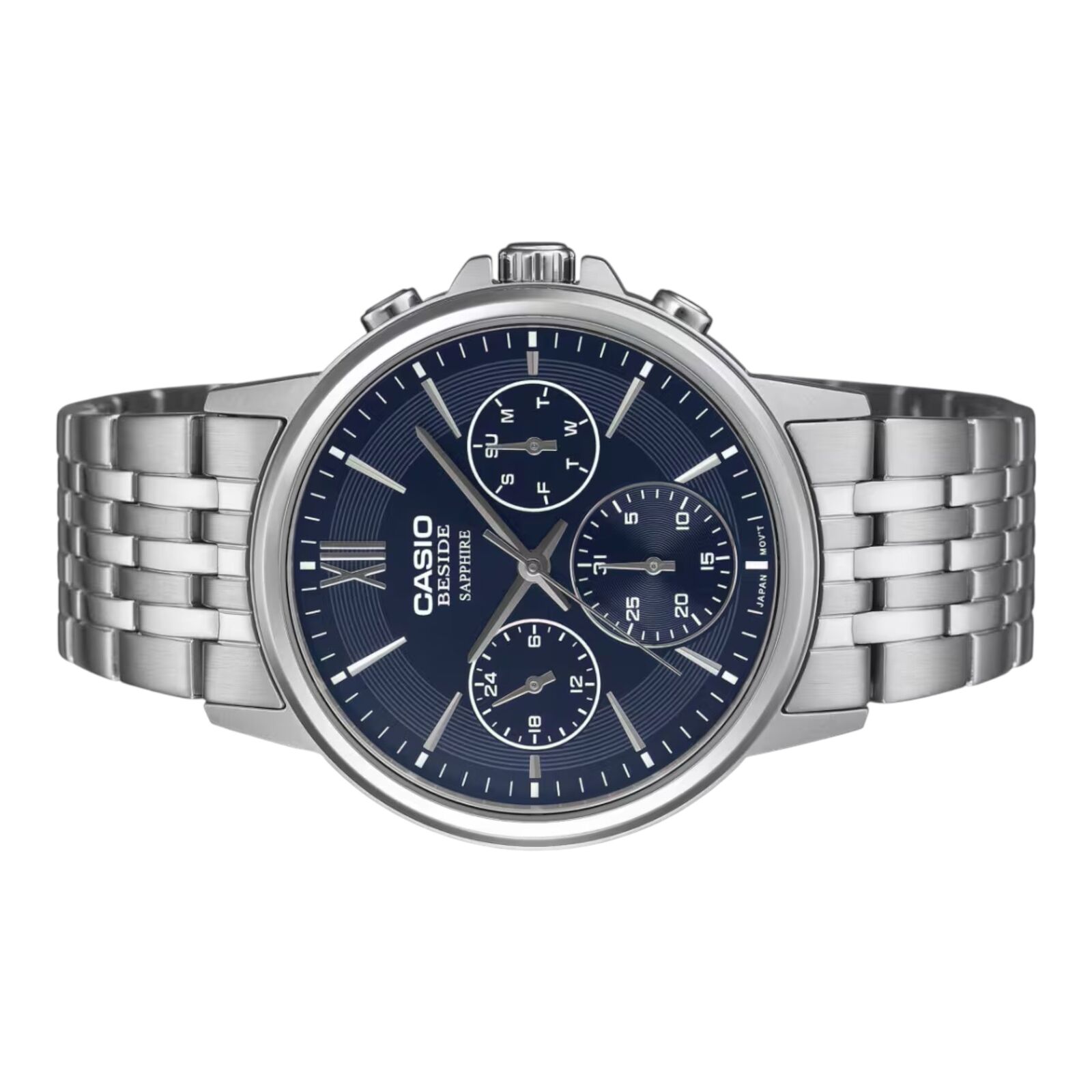 The Casio BMS-300D-2AV from the Beside series delivers refined styling with a striking blue dial and solid stainless steel bracelet. Designed for business settings and formal occasions, this timepiece combines polished sophistication with dependable everyday performance.
