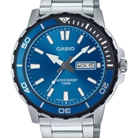The Casio MTD-125D-2A1V is a durable sports watch designed for everyday wear and water activities. Featuring a bold blue dial, stainless steel case and bracelet, and a rotating timing bezel, this timepiece offers reliable performance with a rugged marine-inspired design.