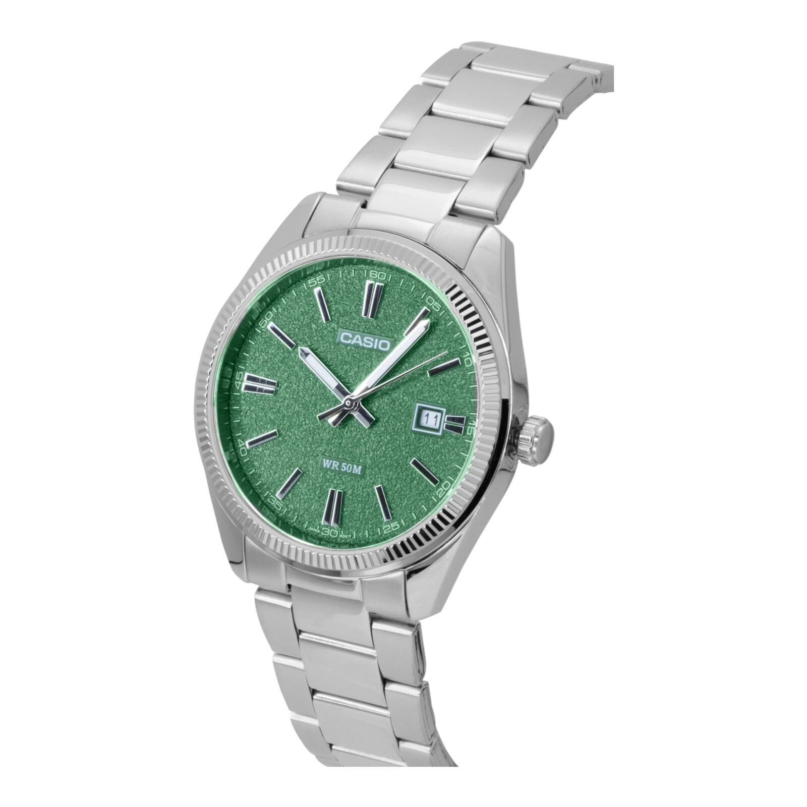 Matte green dial – Finished with a subtle texture and silver-tone hands