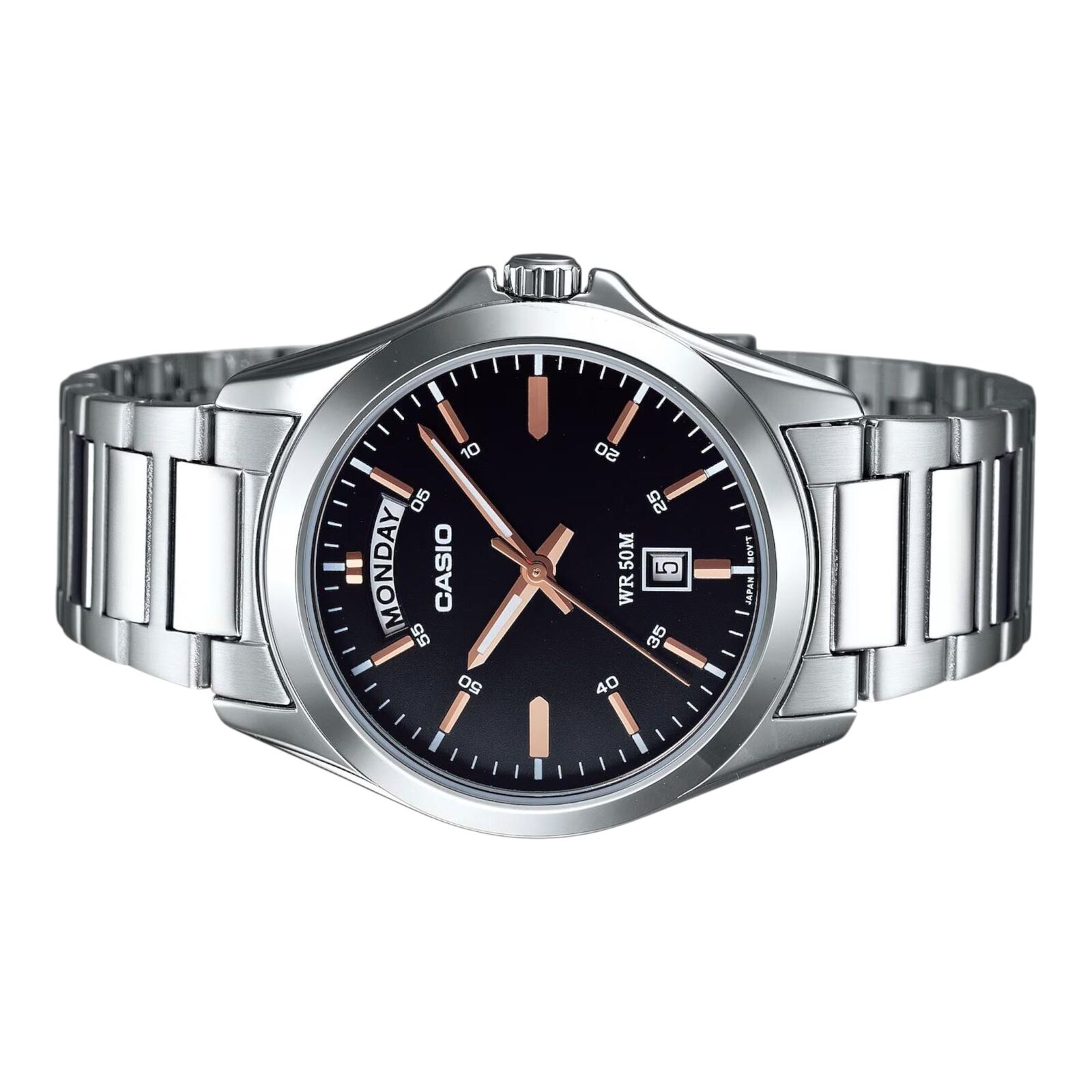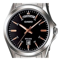 The Casio MTP-1370D-1A2V features a classic analog design with a black dial and stainless steel band. With a clear day and date display and a clean layout, this model is built for everyday wear with practical functionality.