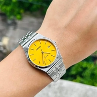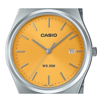 The Casio MTP-B145D-9AV is a unisex analog watch inspired by classic 1980s styling, featuring a clean yellow dial paired with a slim stainless steel case. The minimalist layout ensures excellent readability while delivering a bold retro look suited to everyday wear.