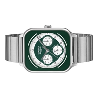 The Casio MTP-M307D-3BV is a modern classic with a rich green dial and polished stainless steel finish. Its three inset subdials display the day, date, and 24-hour time, offering both function and style. Designed for everyday wear, this model pairs durability with a striking look.