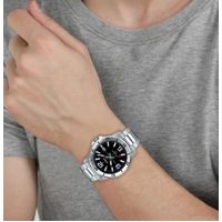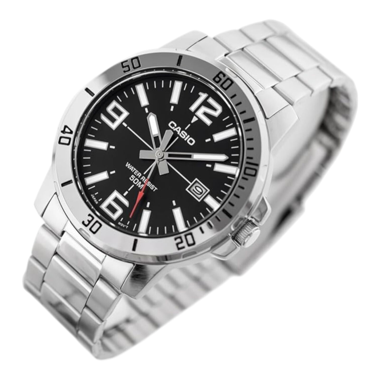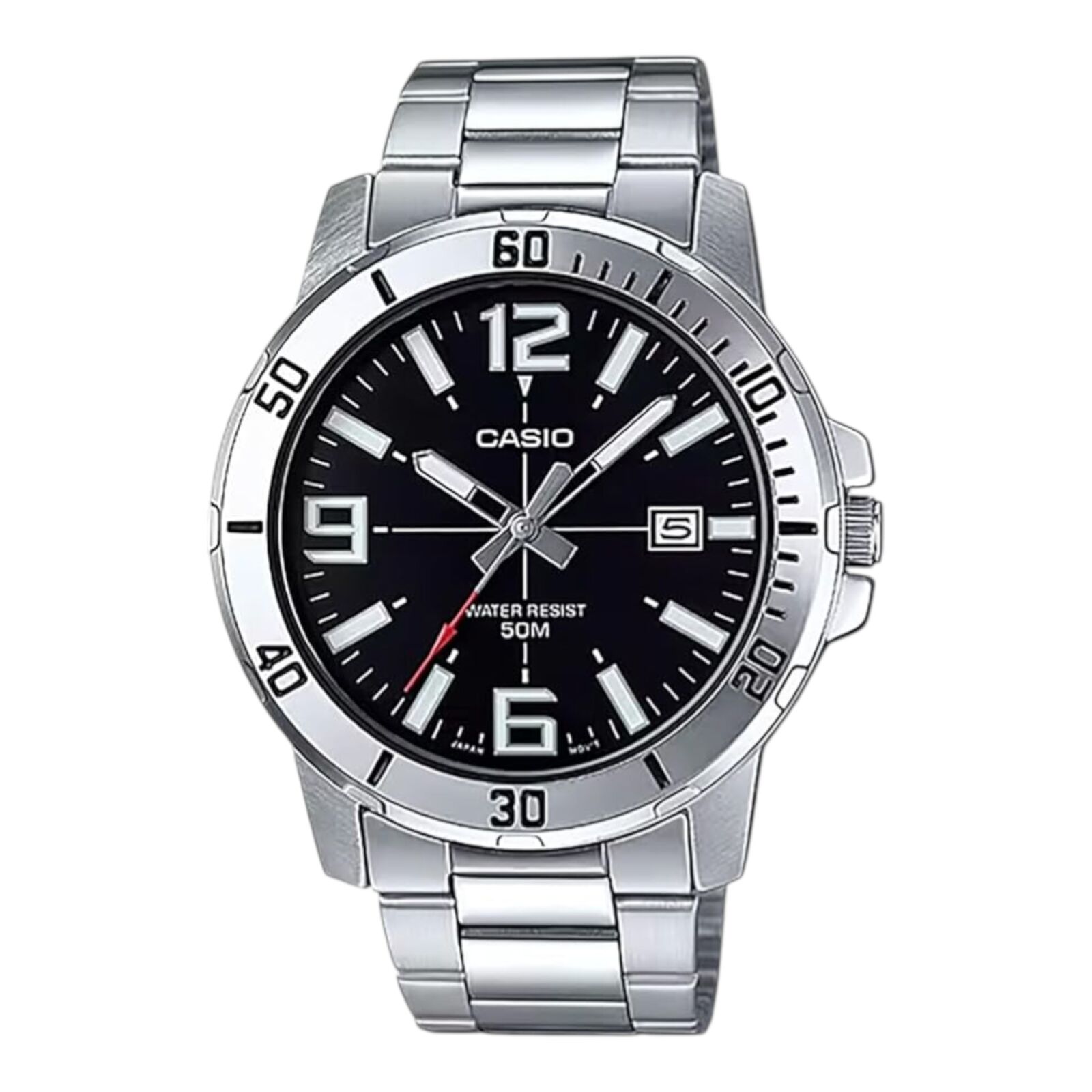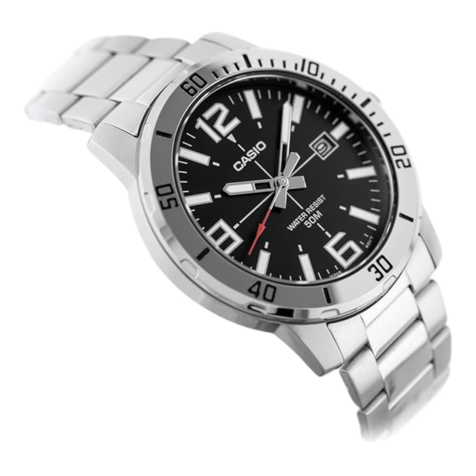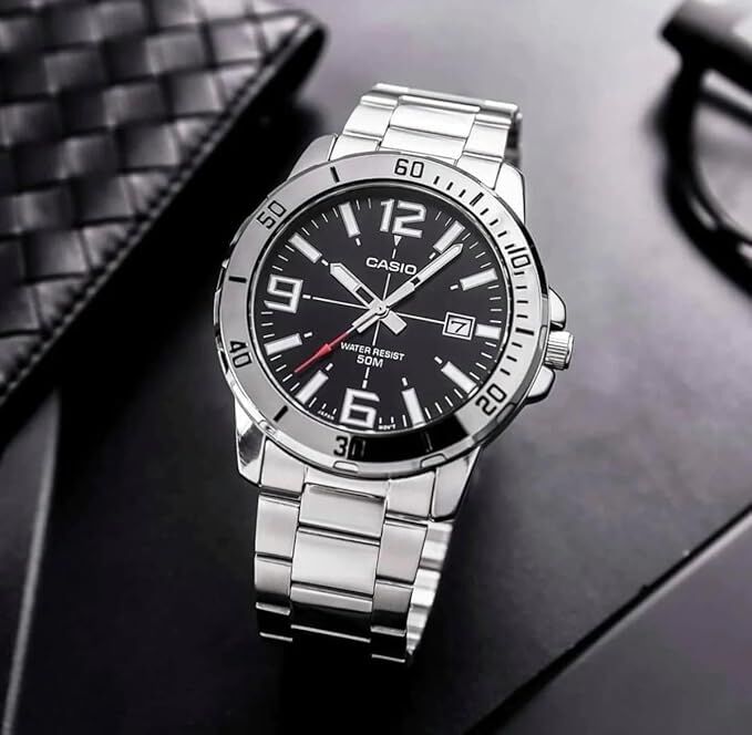 The Casio MTP-VD01D-1BV features a bold analog design with a black dial and silver tone stainless steel band. The detailed bezel and large markers create a sporty look while maintaining everyday practicality.