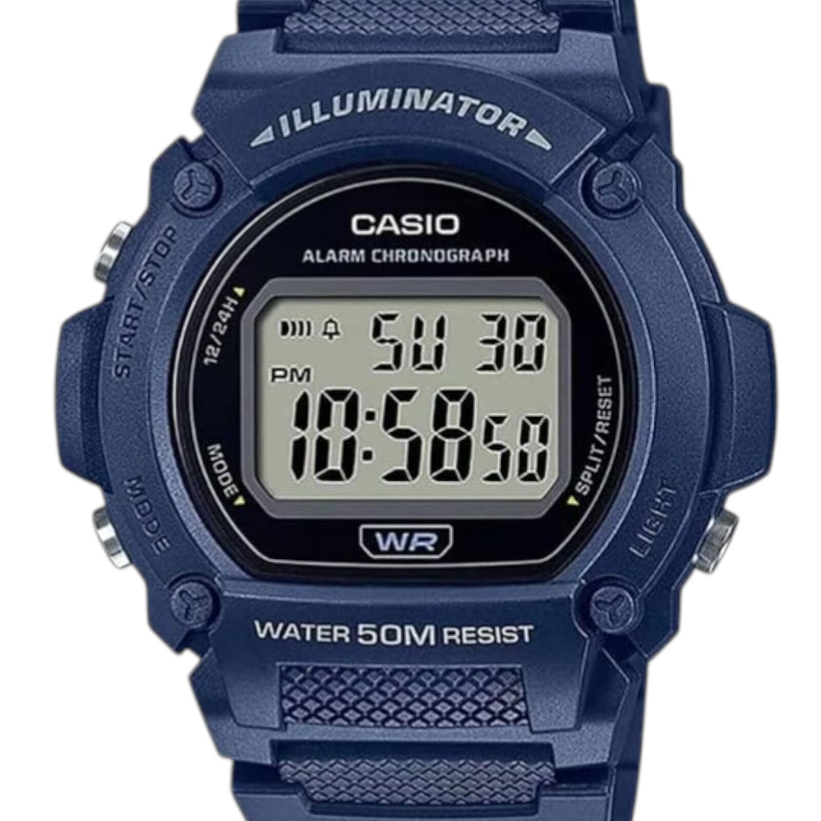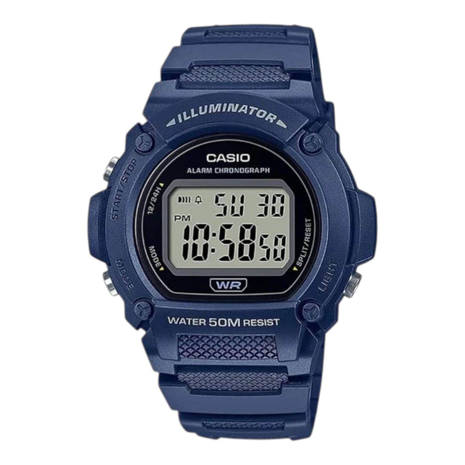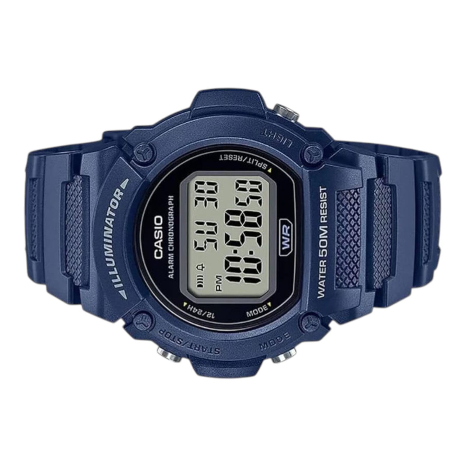 The Casio W-219H-2AV features a bold digital design with a blue resin band and clear display for everyday use. Built with a durable construction and simple functionality, this model offers reliable performance for daily wear.