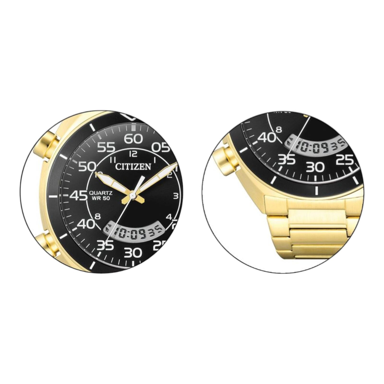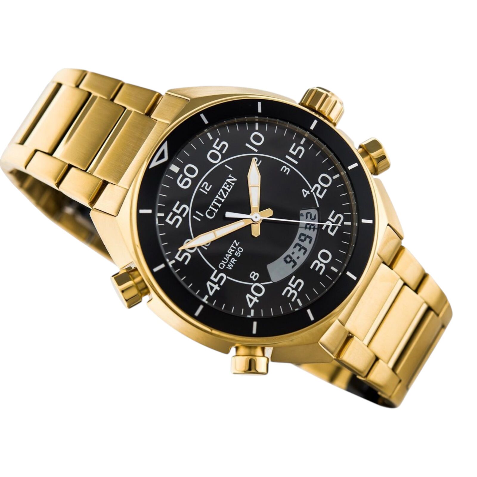 The Citizen JM5472-52E mens watch features a digital analog hybrid display set within a gold tone stainless steel case and matching gold band. Powered by Citizen Eco-Drive technology, it converts light into energy and delivers chronograph performance with multi-function practicality in a bold black and gold design.