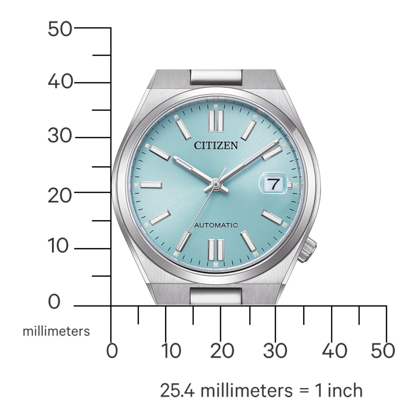 The Citizen NJ0200-50L Tsuyosa features a refined 37mm stainless steel case paired with a matching stainless steel band and ice blue analog dial. Designed for those preferring a more compact profile, it retains the integrated styling and automatic performance of the Tsuyosa collection.