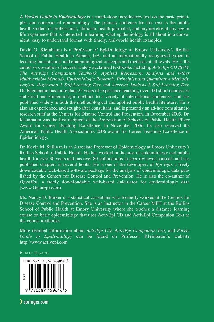 Author: David G. Kleinbaum,Kevin M. Sullivan,Nancy D. BarkerPublisher: SpringerCategory: Public Health & Preventive Medicine, Epidemiology & Medical Statistics, Infectious & Contagious Diseases, Oncology, Terminal Care NursingBook Format: PaperbackIn the nearly three years since the publication of the ActivEpi companion text, the authors received several suggestions to produce an abbreviated version that narrows the discussion to the most essential principals and methods. A Pocket Guide to Epidemiology contains less than half as many pages as the ActivEpi Companion Text and is a stand-alone introductory text on the basic principals and concepts of epidemiology.