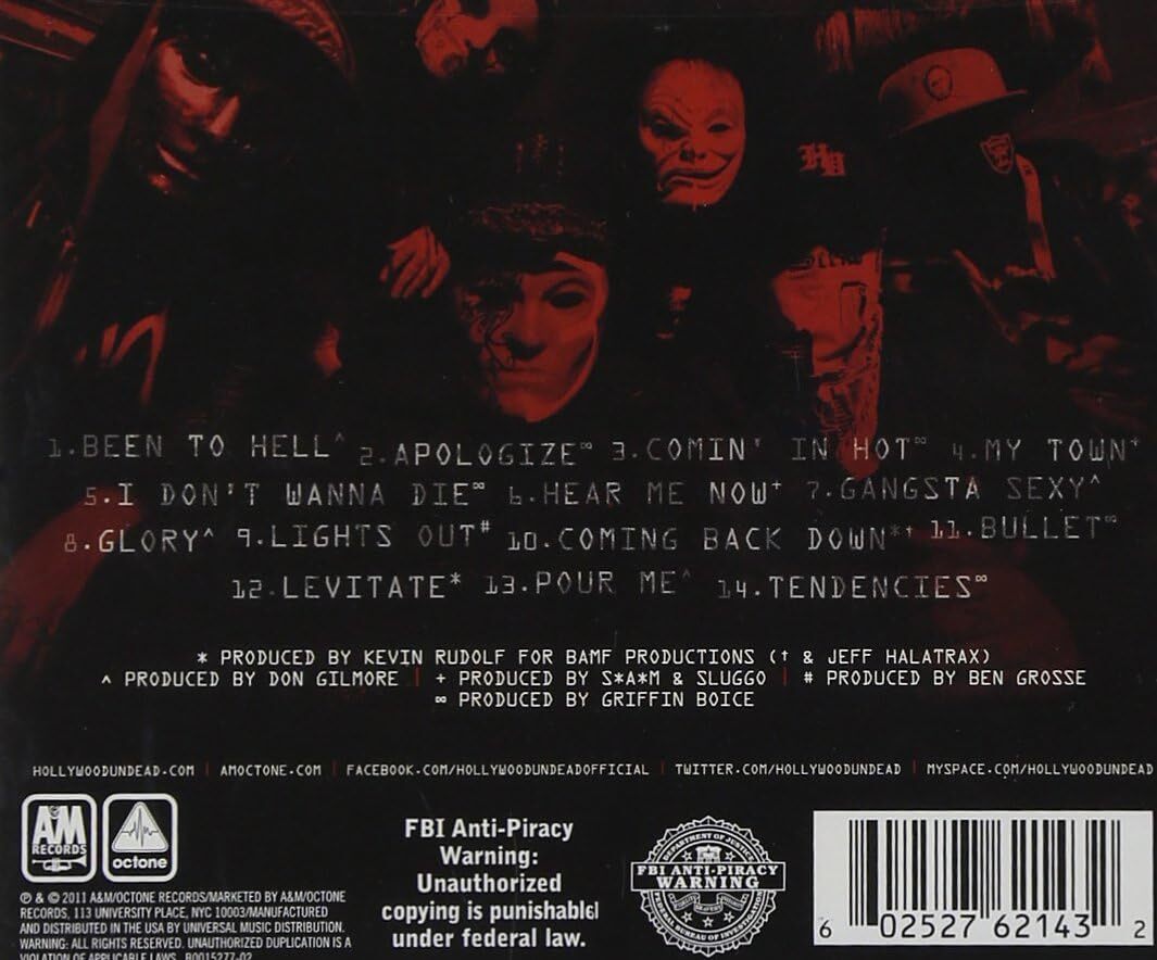 1. Been To Hell Producer – Don Gilmore Written-By – Danny*, Johnny 3 Tears*, Charlie Scene*, J-Dog* Producer – Don Gilmore Written-By – Danny*, Johnny 3 Tears*, Charlie Scene*, J-Dog* 2. Apologize Producer – Griffin Boice Written-By – Danny*, Johnny 3 Tears*, Charlie Scene*, J-Dog*, Da Kurlzz* Producer – Griffin Boice Written-By – Danny*, Johnny 3 Tears*, Charlie Scene*, J-Dog*, Da Kurlzz* 3. Comin' In Hot Producer – Griffin Boice Written-By – Danny*, Funny Man*, Charlie Scene* Producer – Griffin Boice Written-By – Danny*, Funny Man*, Charlie Scene* 4. My Town Producer – Dave Katz, Sam Hollander Written-By – Danny*, Funny Man*, Johnny 3 Tears*, Charlie Scene*, J-Dog*, Da Kurlzz* Producer – Dave Katz, Sam Hollander Written-By – Danny*, Funny Man*, Johnny 3 Tears*, Charlie Scene*, J-Dog*, Da Kurlzz* 5. I Don't Wanna Die Producer – Griffin Boice Written-By – Danny*, Johnny 3 Tears*, Charlie Scene*, J-Dog* Producer – Griffin Boice Written-By – Danny*, Johnny 3 Tears*, Charlie Scene*, J-Dog* 6. Hear Me Now Producer – Dave Katz, Sam Hollander Written-By – Danny*, Johnny 3 Tears*, Charlie Scene*, J-Dog* Producer – Dave Katz, Sam Hollander Written-By – Danny*, Johnny 3 Tears*, Charlie Scene*, J-Dog* 7. Gangsta Sexy Producer – Don Gilmore Written-By – Danny*, Funny Man*, Charlie Scene* Producer – Don Gilmore Written-By – Danny*, Funny Man*, Charlie Scene* 8. Glory Producer – Don Gilmore Written-By – Danny*, Johnny 3 Tears*, J-Dog* Producer – Don Gilmore Written-By – Danny*, Johnny 3 Tears*, J-Dog* 9. Lights Out Producer – Ben Grosse Written-By – Danny*, Funny Man*, Charlie Scene*, J-Dog* Producer – Ben Grosse Written-By – Danny*, Funny Man*, Charlie Scene*, J-Dog* 10. Coming Back Down Producer – Jacob Kasher, Jeff Halavacs, Kevin Rudolf Written-By – Danny*, Johnny 3 Tears*, J-Dog* Producer – Jacob Kasher, Jeff Halavacs, Kevin Rudolf Written-By – Danny*, Johnny 3 Tears*, J-Dog* 11. Bullet Producer – Griffin Boice Written-By – Danny*, Johnny 3 Tears*, Charlie Scene*, J-Dog* Producer – Griffin Boice Written-By – Danny*, Johnny 3 Tears*, Charlie Scene*, J-Dog* 12. Levitate Producer – Jacob Kasher, Kevin Rudolf Written-By – Danny*, Johnny 3 Tears*, Charlie Scene*, J-Dog* Producer – Jacob Kasher, Kevin Rudolf Written-By – Danny*, Johnny 3 Tears*, Charlie Scene*, J-Dog* 13. Pour Me Producer – Don Gilmore Written-By – Danny*, Johnny 3 Tears*, J-Dog* Producer – Don Gilmore Written-By – Danny*, Johnny 3 Tears*, J-Dog* 14. Tendencies Producer – Griffin Boice Written-By – Danny*, Johnny 3 Tears*, J-Dog*, Da Kurlzz* Producer – Griffin Boice Written-By – Danny*, Johnny 3 Tears*, J-Dog*, Da Kurlzz*
