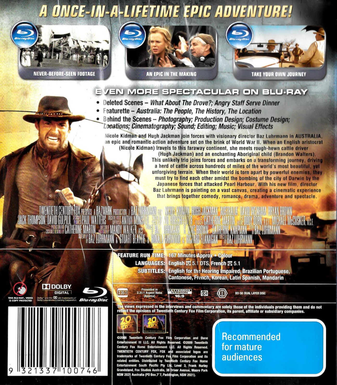 Nicole Kidman and Hugh Jackman join forces with visionary director Baz luhrmann in Australia, an epic and romantic action adventure set on the brink of World War II. When an English aristocrat travels to this faraway continent, she meets rough hewn cattle driver and an enchanting Aboriginal child. This unlikely trio joins forces and embarks on a transforming journey, driving a herd of cattle across hundreds of miles of the world's most beautiful, yet unforgiving terrain. When their world is torn apart by powerful enemies, they must try to find each other amidst the bombing of the city of Darwin by the Japanese forces that attacked Pearl Harbour. With this new film, director Baz Luhrmann is painting on a vast canvas, creating a cinematic experience that brings together comedy, romance, drama, adventure and spectacle.