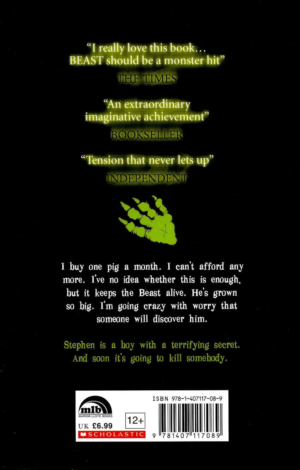 In the depths of a reservoir lives a monstrous creature. Its existence is unknown to anyone except the teenage boy who feeds it. Six years ago it was a vicious little baby. Now it has grown huge, and its rusting cage can't hold it much longer . . . Stephen is a boy with many secrets, and the Beast is the biggest. His life in foster care, always bad, is getting worse, and he's in trouble with the police. All the odds are against him finding a decent place in the world, but his efforts to free himself of the Beast make him a hero that readers will never forget.