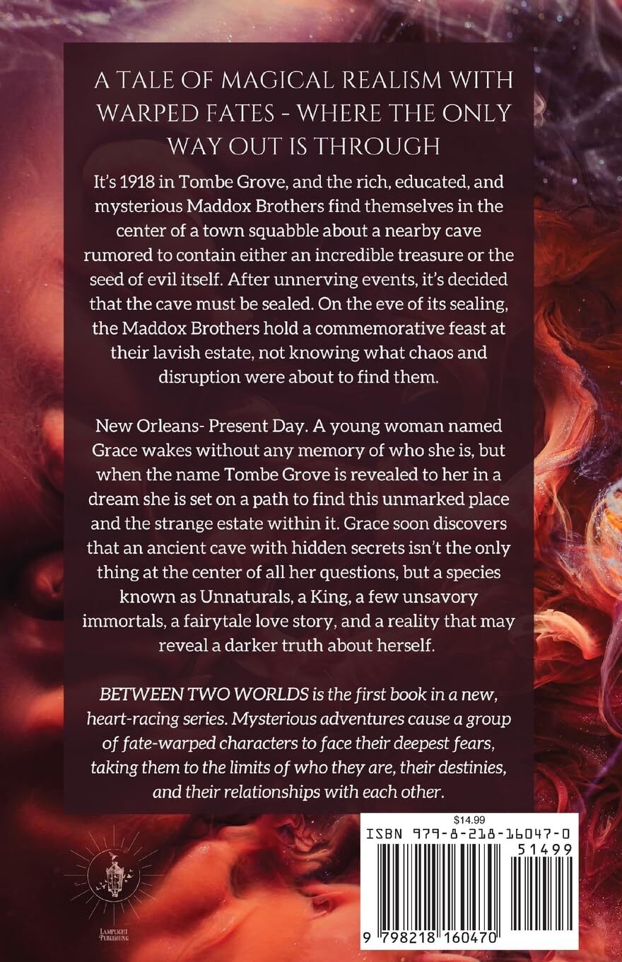 • Its 1918 in Tombe Grove, and the rich, educated, and mysterious Maddox Brothers find themselves in the center of a town squabble about a nearby cave rumored to contain either an incredible treasure or the seed of evil itself. After unnerving events, its decided that the cave must be sealed. On the eve of its sealing, the Maddox Brothers hold a commemorative feast at their lavish estate, not knowing what chaos and disruption were about to find them.New Orleans- Present Day. A young woman named Grace wakes without any memory of who she is, but when the name Tombe Grove is revealed to her in a dream she is set on a path to find this unmarked place and the strange estate within it. Grace soon discovers that an ancient cave with hidden secrets isnt the only thing at the center of all her questions, but a species known as Unnaturals, a King, a few unsavory immortals, a fairytale love story, and a reality that may reveal a darker truth about herself. BETWEEN TWO WORLDS is the first book in a new, heart-racing series. Mysterious adventures cause a group of fate-warped characters to face their deepest fears, taking them to the limits of who they are, their destinies, and their relationships with each other.