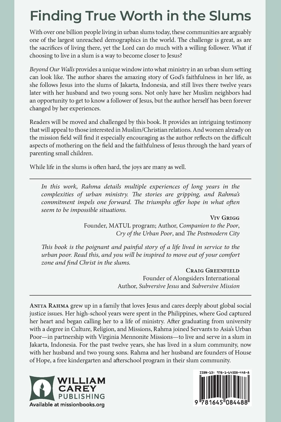 Finding True Worth in the Slums With over one billion people living in urban slums today, these communities are arguably one of the largest unreached demographics in the world. The challenge is great, as are the sacrifices of living there, yet the Lord can do much with a willing follower. So, what if choosing to live in a slum is a way to become closer to Jesus? Beyond Our Walls provides a unique window into what ministry in an urban slum setting can look like. The author shares the amazing story of Gods faithfulness in her life, as she follows Jesus into the slums of Jakarta, Indonesia, and still lives there twelve years later with her husband and two young sons. Not only have her Muslim neighbors had an opportunity to get to know a follower of Jesus, but the author herself has been forever changed by her experiences. Readers will be moved and challenged by this book. It provides an intriguing testimony that will appeal to those interested in Muslim/Chrisitan relations. And women already on the mission field will find it especially encouraging as the author reflects on the difficult aspects of mothering on the field and the faithfulness of Jesus through the hard years of parenting small children. While life in the slums is often hard, the joys are many as well.