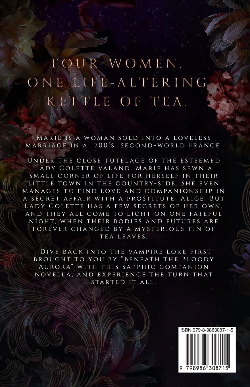 • Marie is a woman sold into a loveless marriage in a 1700s, second-world France. Under the close tutelage of the esteemed Lady Colette Valand, Marie has sewn a small corner of life for herself in their little town in the country-side. She even manages to find love and companionship in a secret affair with a prostitute, Alice. But Lady Colette has a few secrets of her own, and they all come to light on one fateful night, when their bodies and futures are forever changed by a mysterious tin of tea leaves.Dive back into the vampire lore first brought to you by "Beneath the Bloody Aurora" with this sapphic companion novella, and experience the turn that started it all.