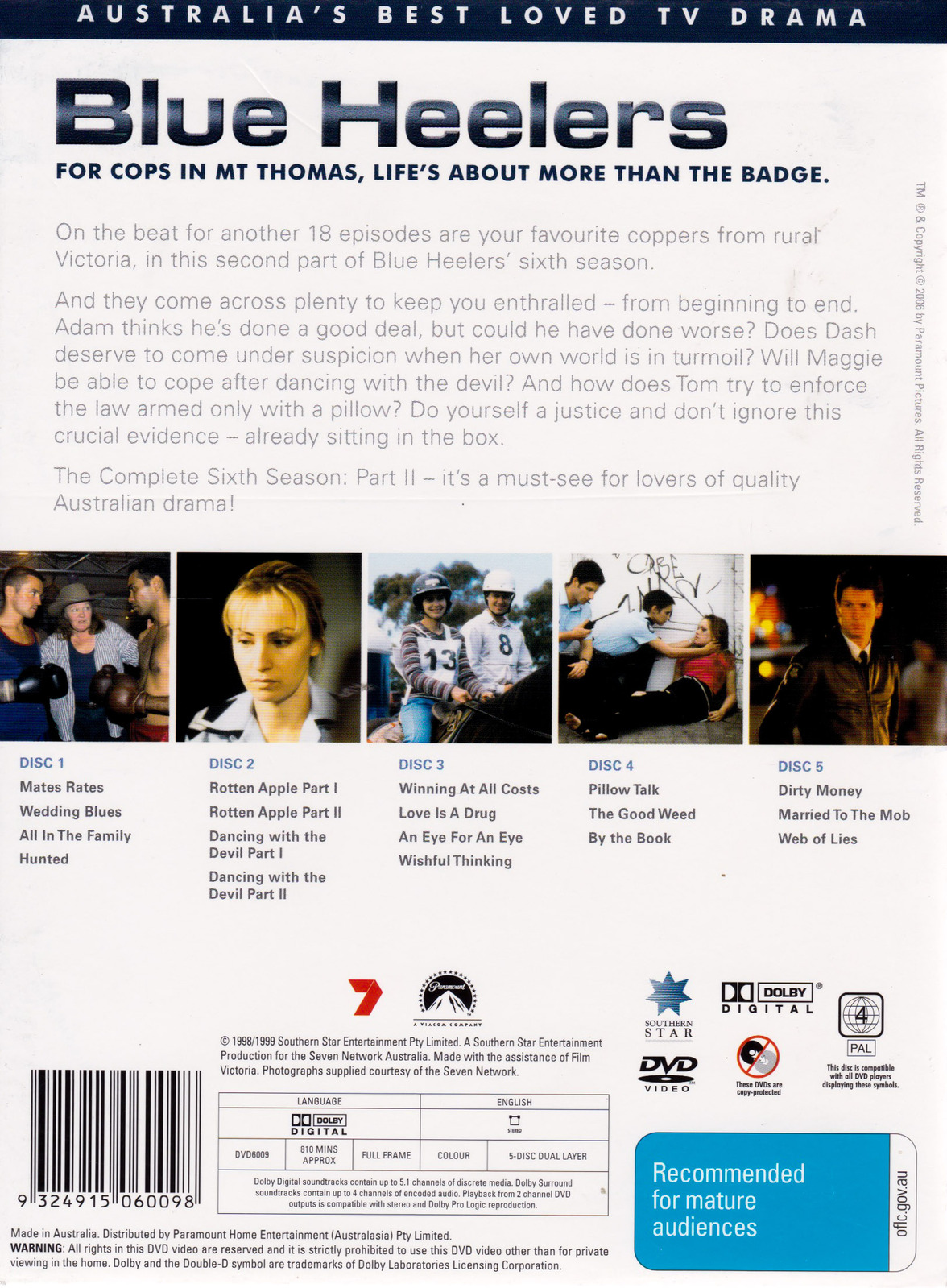 Work, play and drama are never far apart for the Mt Thomas cops in this Sixth Season of the muti-award winning series. Back on the beat are all the faces from the last season and each is faced with brand new challenges. When everything else is thrown at them, how do Maggie and PJ cope with whats between them? How do Tom and Nick react when the heats really on? Later will Nick see the woods for the trees and does Tom eventually go soft? Theres only one way to find out, report for duty in front of your DVD player with this box set. The complete Sixth Season Part I its a must see for lovers of quality Australian drama.