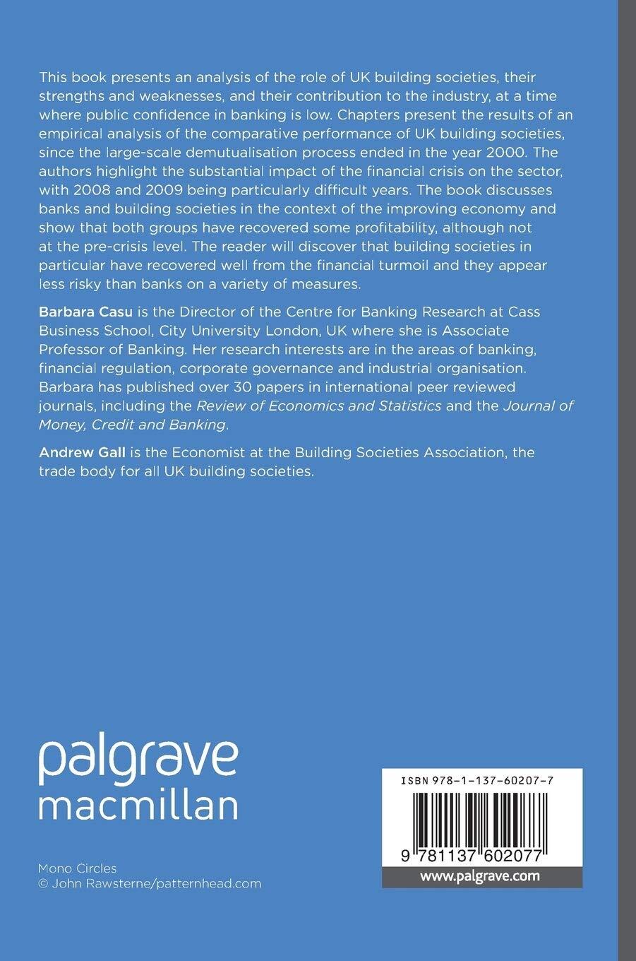 Barbara Casu is the Director of the Centre for Banking Research at Cass Business School, City University London, where she is Professor of Banking. Her research interests are in the areas of banking, financial regulation, corporate governance and industrial organisation. Barbara has published over 30 papers in international peer reviewed journals, including the Review of Economics and Statistics and the Journal of Money, Credit and Banking. Andrew Gall is the Economist at the Building Societies Association, the trade body for all UK building societies.| SKU | BK-9781137602077 |