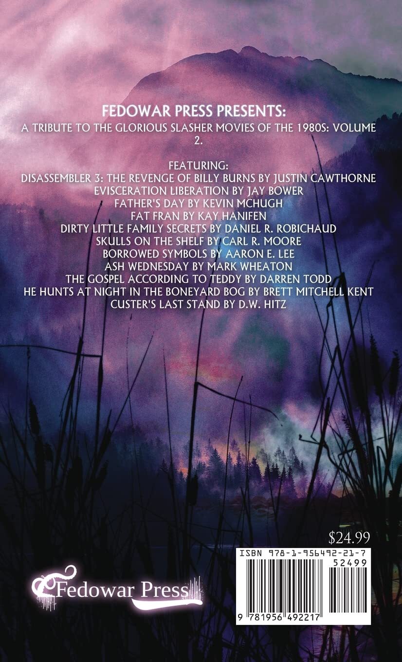 • A tribute to the glorious slasher movies of the 1980s, Volume 2.Featuring:Evisceration Liberation by Jay BowerDisassembler 3: The Revenge Of Billy Burns by Justin CawthorneFat Fran by Kay HanifenCusters Last Stand by D.W. HitzHe Hunts at Night in the Boneyard Bog by Brett Mitchell KentBorrowed Symbols by Aaron E. LeeFathers Day by Kevin McHughSkulls on the Shelf by Carl R. MooreDirty Little Family Secrets by Daniel R. RobichaudThe Gospel According to Teddy by Darren ToddAsh Wednesday by Mark Wheaton
