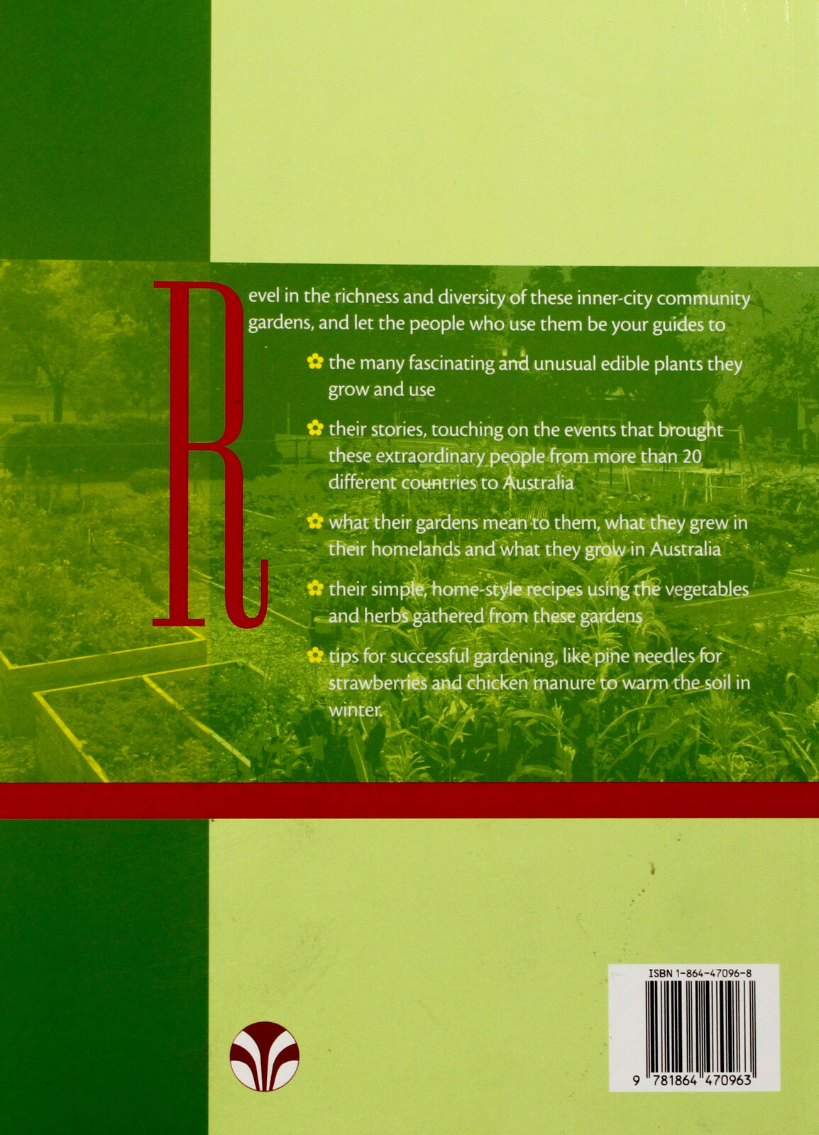 Revel in the richness and diversity of these inner-city community gardens, and let the people who use them by your guides to: The many fascinating and unusual edible plants they grow and use; their stories, touching on the events that brought these extraordinary people from over 20 different countries to Australia; What their gardens meant to them, what they grew in their homelands and what they grow in Australia; Their simple, home-style recipes using the vegetables and herbs gathered from these gardens; Tips for successful gardening like pine needles for strawberries and chicken manure to warm the soil in winter.