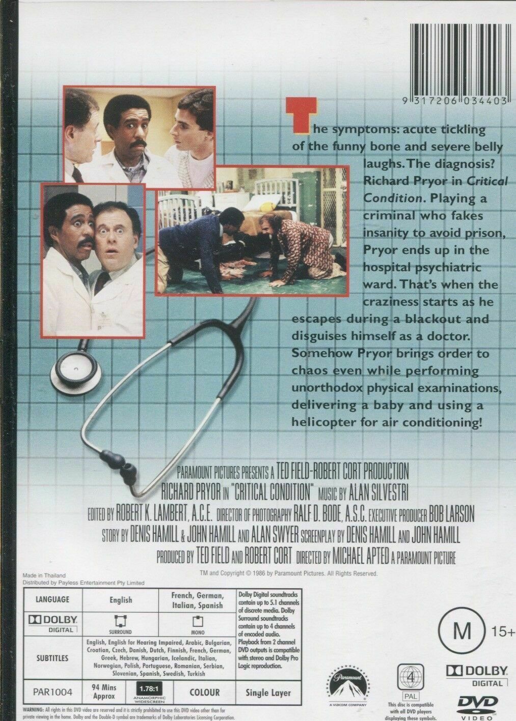 Info: The symptoms: acute tickling of the funny bone and severe belly laughs. The diagnosis? Richard Pryor in Critical Condition. Playing a criminal who fakes insanity to avoid prison, Pryor ends up in the hospital psychiatric ward. That's when the craziness starts as he escapes during a blackout and disguises himself as a doctor. Somehow Pryor brings order to chaos even while performing unorthodox physical examinations, delivering a baby, and using a helicopter for air conditioning!