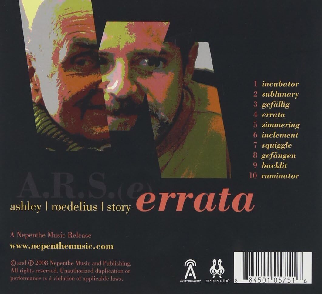 Product Description When recording artists Hans Joachim Roedelius, Tim Story and Dwight Ashley came together at Tims Ohio studio to make recordings, both the technique of composing and the finished product echoed the character of this emblematic phrase - at once, both comical and mystical. The 10 aural collages that resulted from their recording session reflect what Surrealist Nicolas Calas characterized as "the unconscious reality in the personality of the group," derived from a state Max Ernst wryly dubbed "mental contagion." Commenting on the effects of this, Ashley remarks: "Its not uncommon for people to hear an element in the recordings and think oh, thats a classic Story riff, when in fact, Ach or I actually contributed that bit." So, what do you get when you combine the melodious musings of Hans Joachim Roedelius, the nuanced phrasings of Tim Story and the sonic colorations of Dwight Ashley? You get the sonic colorations of Roedelius, the melodious musings of Story, and the nuanced phrasing of Ashley. In short, you get a distinctly different fourth entity that emerges from the group, rather than the individual. From the rhythm-fueled, epic "squiggle" to the brief, wonderfully abstract title track, Errata echoes the Surrealist credo that "poetry must be made by all, and not by one." Review When things go well for musicians brought together to jam, a sense of precognition touches each player. Under just the right circumstances, music happens in a wonderful creative flow - within which everyone sounds off (or holds back) in perfect accord. This chemistry can be found on ERRATA (4927"), the unhindered true expression between collaborators Dwight Ashley, Hans-Joachim Roedelius and Tim Story. Their ten willfully strange oddball sonic constructions seem drawn equally from each distinctive musical orientation, and areas never before accessed. The first several tracks are a quirky, creaky odd mix-up of steady beats and free melodic invention - culminating in a 10 minute fast lane free-for-all jam session representative of all that is ecstatic in music. The whirling jams are reined in on the three remaining pieces. Grainy textures breathe slowly beneath luminescent synth pads and ethereal reedy tones, which creates a lovely holding environment. At last, along with bowed strings and subtly distorted electronics, a haunting piano riff reiterates with increasing curiosity. The result is sparse in delivery but dense with emotion. On ERRATA Ashley, Roedelius, and Story create an atmospheric masterpiece - with a wildness that never turns reckless, and a space that is always in motion. --Chuck Van Zyl - Stars EndAttempting to chart the history of the Dwight Ashley/Hans-Joachim Roedelius/Tim Story triad would easily fill a chapter in any encyclopedia electronica, so it s sufficient to say that between the three of them they make one helluva brave noise. Ashley and Story already have a number of excellent collaborations between them, including the minor classic A Desperate Serenity on the defunct Multimood label (well worth seeking out); Story and Roedelius have recorded together as Lunz, with two worthwhile discs to their credit. Now the three are an item, their debut Errata credited to the puzzlingly nicked A.R.S. If you discard whatever ridicule (or irony) might be gleaned from that abbreviation, you d discover the well-wrought potential met and delivered on the trio s first long-player. Who does what is difficult to discern, which often makes for the best combinations: both Story and Roedelius no doubt contribute most of the acoustic piano parts, but all three masterfully tweak their electronic gadgetry in blissful anonymity. Basically, there s nothing else out there that sounds quite like this. Incubator reincarnates early Cluster thanks to its chimera-like structure, one part quacking pulse, one part purring background noise, numerous parts strangely flanged electronics. On Gefallig , someone s tickling the ivory plains under a shuffling, fading sunset of a rhythm while faux horns blow and delicate if tenebrious effects phosphordot the landscape. Both Inclement and Squiggle chart murky terrain, peculiar electronic doodles zipping about like elfish simulacra; squishy rhythms become a gamelan orchestra conducted by astronauts as stabs of rasping synth wail in protest. For reasons unknown, the closing Ruminator brings things back to normal , its Budd-ing pianos suggesting early evening come down from those atmospheric highs. Quasi-chilling but not chilled, this is a trio light on its feet, nimble of phrase and savvy in composition, trading dark and light with extraordinary finesse and crystal clarity. --Darren Bergstein - ei audioveriteSpecifics