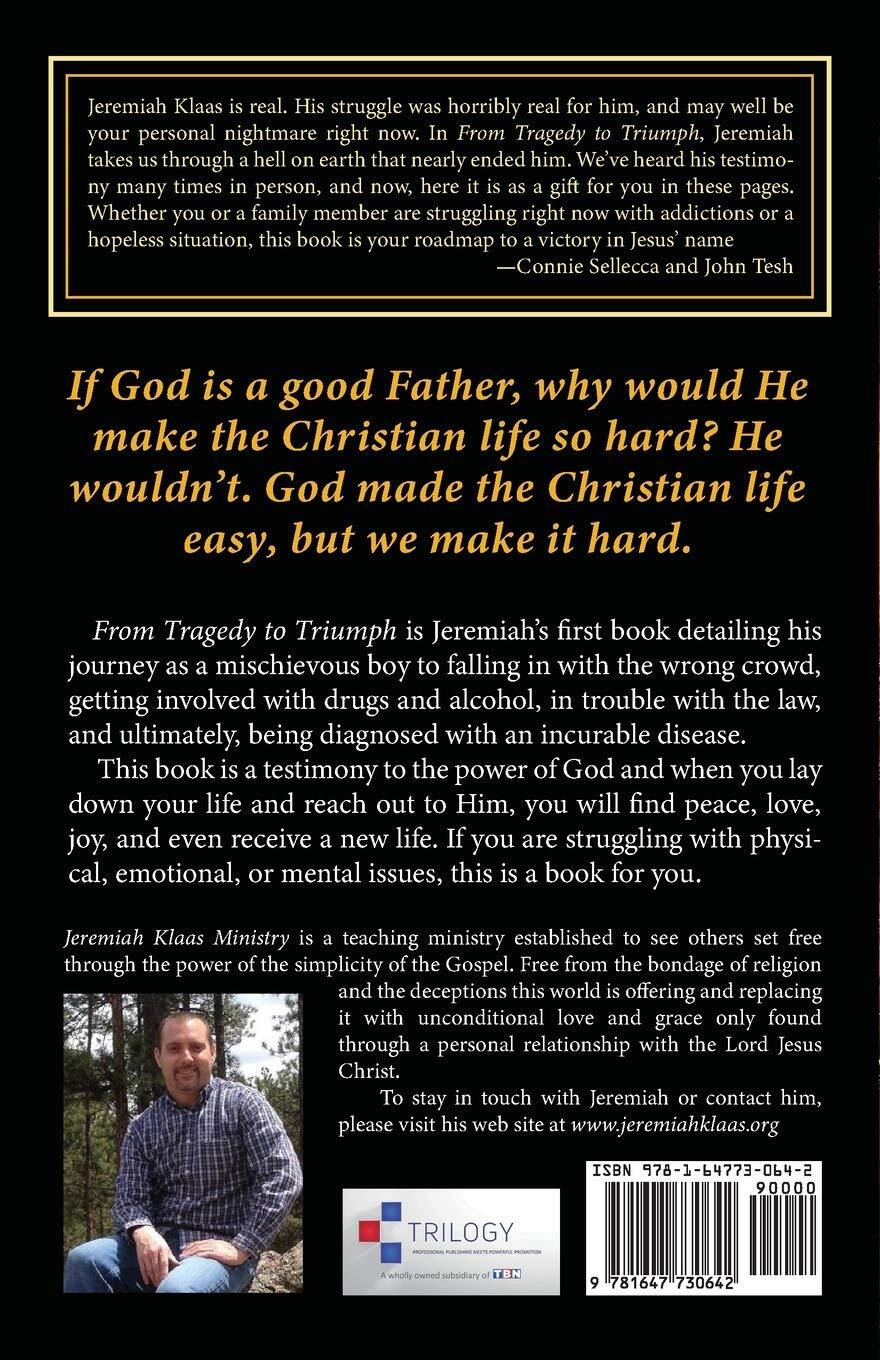 • If God is a good Father, why would He make the Christian life so hard? He wouldnt. God made the Christian life easy, but we make it hard.From Tragedy to Triumph is Jeremiahs first book detailing his journey as a mischievous boy to falling in with the wrong crowd, getting involved with drugs and alcohol, in trouble with the law, and ultimately, being diagnosed with an incurable disease.This book is a testimony to the power of God and when you lay down your life and reach out to Him, you will find peace, love, joy, and even receive a new life. If you are struggling with physical, emotional, or mental issues, this is a book for you.