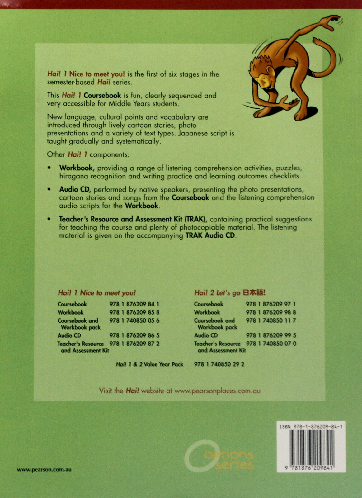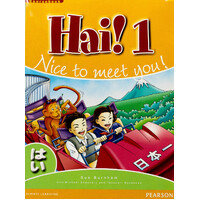 With six semester-length, topic-based stages, Hai! is geared to the crucial middle years where student motivation and experience of progress are so important. Unit topics * The writing is different! * All about me and my friends * I can count! * Excuse me, what's the time? * In class * About Japan Some features of each unit: *Flap those ears! Move that mouth!-the photo presentation showcases new language and cultural information. Audio response opportunities are given on the Audio CD. *Grab that pen!-introduces the hiragana; is closely tied to the teaching of language points in each unit so that students learn to write what they can say. *Help Desk-the reference section where the new language and key vocabulary are given in a simple, easy-to-follow layout. *Move that mouth!-provides structured, semi-structured and open-ended speaking activities modelled on the now familiar language. *Flap those ears! Move those eyes!-the cartoon story, following the junior high romance of Hide and Kana, provides an opportunity for reading for pleasure and consolidates the language and script at the point where students have become romaji-independent. There are also computer-based research activities, and Japanese/English and English/Japanese vocabulary lists.