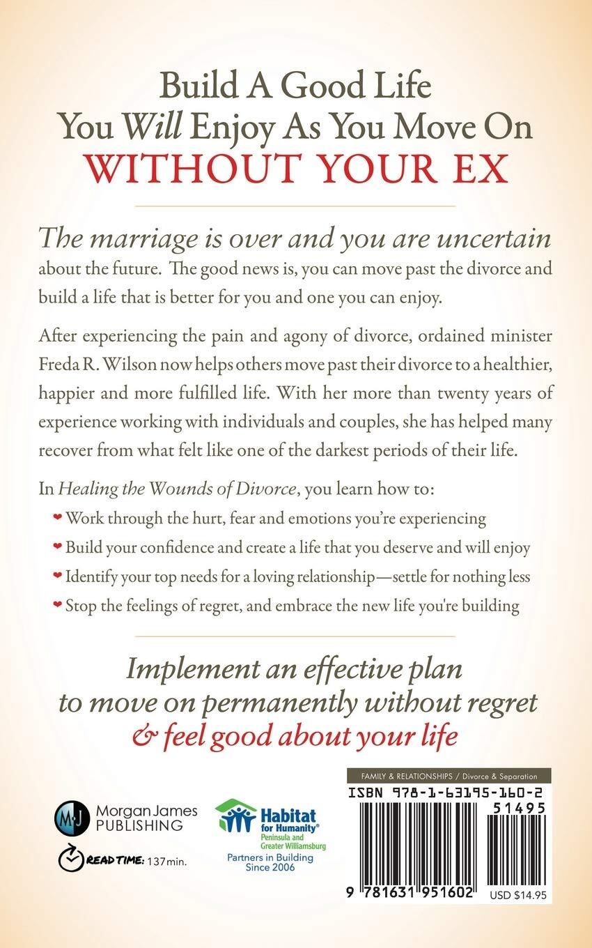 • Healing the Wounds of Divorce helps those suffering from divorce go from grieving to hoping, and from surviving to thriving. After experiencing the pain and agony of divorce, ordained minister Freda R. Wilson now helps others to build their futures that are better, both inside and out. With her more than twenty years of experience working with individuals and couples, she helps those suffering from divorce recover from what may seem like the darkest period of their life. In Healing the Wounds of Divorce, divorcees learn how to: Gain the strength they need so that they can move on with their life Learn to work through the hurt and different emotions so they can feel good again Find hope as they learn to heal Be confident about their future as they move on without their ex Connect with their faith