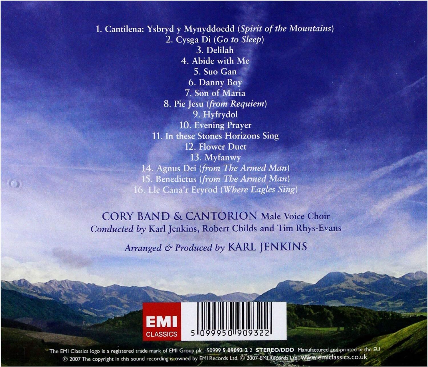 1. Cantilena: Ysbryd y Mynyddoedd (Spirit Of The Mountain) Arranged By – Karl Jenkins, Peter Graham (6) Lyrics By – Graeme Davies* Written-By – Jenkins* Arranged By – Karl Jenkins, Peter Graham (6) Lyrics By – Graeme Davies* Written-By – Jenkins* 2. Cysga Di Arranged By – Karl Jenkins, Rodney Newton Lyrics By – Graeme Davies* Written-By – Dvořák* Arranged By – Karl Jenkins, Rodney Newton Lyrics By – Graeme Davies* Written-By – Dvořák* 3. Delilah Arranged By – Karl Jenkins, Bob Childs* Written-By – Mason*, Reed* Arranged By – Karl Jenkins, Bob Childs* Written-By – Mason*, Reed* 4. Abide With Me Arranged By – Karl Jenkins, Peter Graham (6) Written-By – Monk* Arranged By – Karl Jenkins, Peter Graham (6) Written-By – Monk* 5. Suo Gan Arranged By – Karl Jenkins, Peter Graham (6) Written-By – Traditional Arranged By – Karl Jenkins, Peter Graham (6) Written-By – Traditional 6. Danny Boy Arranged By – Karl Jenkins, Bob Childs* Written-By – Traditional Arranged By – Karl Jenkins, Bob Childs* Written-By – Traditional 7. Son Of Maria Arranged By – Karl Jenkins, Peter Graham (6) Lyrics By – Carol Barratt Written-By – Traditional Arranged By – Karl Jenkins, Peter Graham (6) Lyrics By – Carol Barratt Written-By – Traditional 8. Pie Jesu (From Requiem) Arranged By – Karl Jenkins, Philip Wilby Written-By – Jenkins* Arranged By – Karl Jenkins, Philip Wilby Written-By – Jenkins* 9. Hyfrydol Arranged By – Karl Jenkins, Rodney Newton Written-By – Traditional Arranged By – Karl Jenkins, Rodney Newton Written-By – Traditional 10. Evening Prayer Arranged By – Karl Jenkins, Philip Wilby Translated By [English Translation] – Norman Kelley Written-By – Humperdinck* Arranged By – Karl Jenkins, Philip Wilby Translated By [English Translation] – Norman Kelley Written-By – Humperdinck* 11. In These Stones Horizons Sing Arranged By – Karl Jenkins, Philip Wilby Written-By – Jenkins* Arranged By – Karl Jenkins, Philip Wilby Written-By – Jenkins* 12. Flower Duet Arranged By – Karl Jenkins, Bob Childs* Written-By – Delibes* Arranged By – Karl Jenkins, Bob Childs* Written-By – Delibes* 13. Myfanwy Arranged By – Karl Jenkins, Robert Childs (2) Written-By – Parry* Arranged By – Karl Jenkins, Robert Childs (2) Written-By – Parry* 14. Agnus Dei (From The Armed Man) Arranged By – Karl Jenkins, Tony Small (7) Written-By – Jenkins* Arranged By – Karl Jenkins, Tony Small (7) Written-By – Jenkins* 15. Benedictus (From The Armed Man) Arranged By – Karl Jenkins, Peter Graham (6) Written-By – Jenkins* Arranged By – Karl Jenkins, Peter Graham (6) Written-By – Jenkins* 16. Lle Cana'r Eryrod (Where Eagles Sing) Written-By – Lovatt-Cooper* Written-By – Lovatt-Cooper*