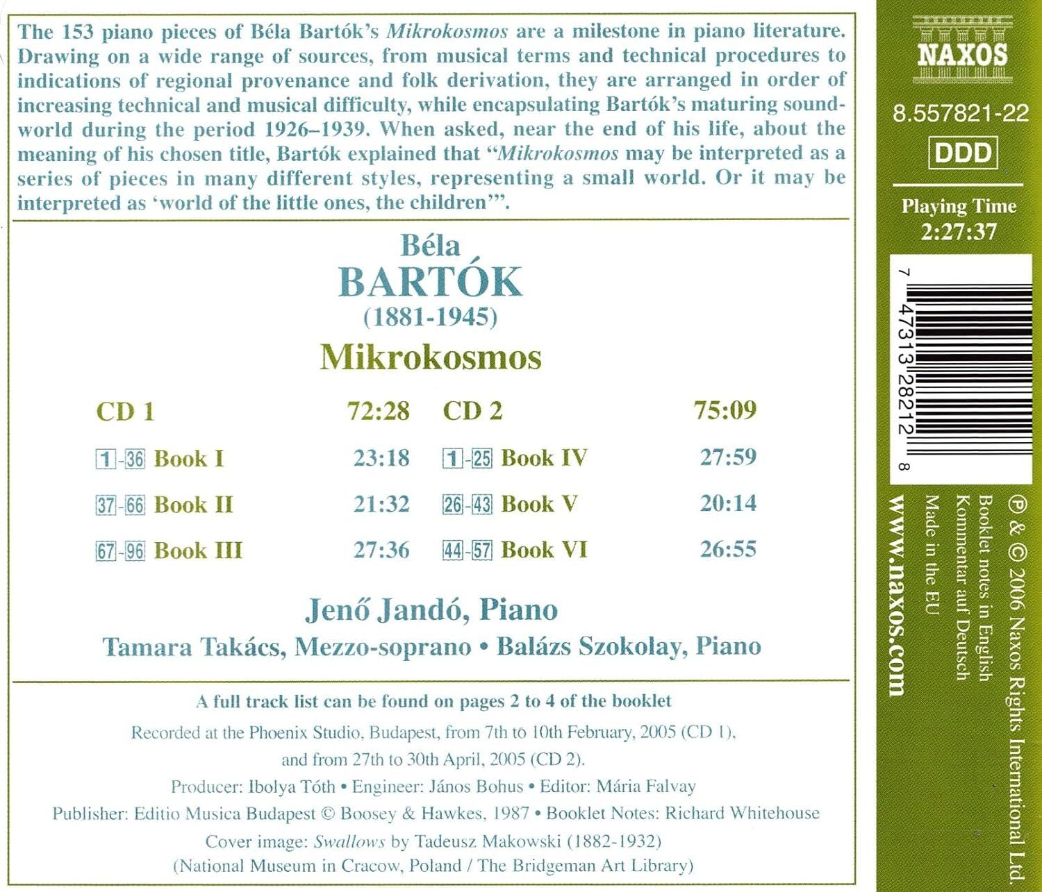 . Book I 1-1. No. 1. Six Unison Melodies (1) 1-2. No. 2. Six Unison Melodies (2) (versions A & B) 1-3. No. 3. Six Unison Melodies (3) 1-4. No. 4. Six Unison Melodies (4) 1-5. No. 5. Six Unison Melodies (5) 1-6. No. 6. Six Unison Melodies (6) 1-7. No. 7. Dotted Notes 1-8. No. 8. Repetition (1) 1-9. No. 9. Syncopation (1) 1-10. No. 10. With Alternate Hands 1-11. No. 11. Parallel Motion 1-12. No. 12. Reflection 1-13. No. 13. Change Of Position 1-14. No. 14. Question And Answer 1-15. No. 15. Village Song 1-16. No. 16. Parallel Motion With Change Of Position 1-17. No. 17. Contrary Motion 1-18. No. 18. Four Unison Melodies (1) 1-19. No. 19. Four Unison Melodies (2) 1-20. No. 20. Four Unison Melodies (3) 1-21. No. 21. Four Unison Melodies (4) 1-22. No. 22. Imitation And Counterpoint 1-23. No. 23. Imitation And Inversion (1) 1-24. No. 24. Pastorale 1-25. No. 25. Imitiation And Inversion (2) 1-26. No. 26. Repetition (2) 1-27. No. 27. Syncopation (2) 1-28. No. 28. Canon At The Octave 1-29. No. 29. Imitation Reflected 1-30. No. 30. Canon At The Lower Fifth 1-31. No. 31. Dance In Canon Form 1-32. No. 32. In Dorian Mode 1-33. No. 33. Slow Dance 1-34. No. 34. In Phrygian Mode 1-35. No. 35. Chorale 1-36. No. 36. Free Canon . Book II 1-37. No. 37. In Lydian Mode 1-38. No. 38. Staccato And Legato (1) 1-39. No. 39. Staccato And Legato (Canon) 1-40. No. 40. In Yugoslav Style 1-41. No. 41. Melody With Accompaniment 1-42. No. 42. Accompaniment In Broken Triads 1-43. No. 43. In Hungarian Style (version A: 2 Pianos; Version B: Piano Solo) 1-44. No. 44. Contrary Motion (2) (2 Pianos) 1-45. No. 45. Meditation 1-46. No. 46. Increasing-Diminishing 1-47. No. 47. County Fair 1-48. No. 48. In Mixolydian Mode 1-49. No. 49. Crescendo-Diminuendo 1-50. No. 50. Minuetto 1-51. No. 51. Waves 1-52. No. 52. Unison Divided 1-53. No. 53. In Transylvanian Style 1-54. No. 54. Chromatics 1-55. No. 55. Triplets In Lydian Mode (2 Pianos) 1-56. No. 56. Melody In Tenths 1-57. No. 57. Accents 1-58. No. 58. In Oriental Style 1-59. No. 59. Major And Minor 1-60. No. 60. Canon With Sustained Notes 1-61. No. 61. Pentatonic Melody 1-62. No. 62. Minor Sixths In Parallel Motion 1-63. No. 63. Buzzing 1-64. No. 64. Line Against Point (versions A & B) 1-65. No. 65. Dialogue (with Voice) 1-66. No. 66. Melody Divided . Book III 1-67. Thirds Against A Single Voice 1-68. No. 68. Hungarian Dance (2 Pianos) 1-69. No. 69. Study In Chords 1-70. No. 70. Melody Against Double Notes 1-71. No. 71. Thirds 1-72. No. 72. Dragons' Dance 1-73. No. 73. Sixths And Triads 1-74. No. 74. Hungarian Matchmaking Song (versions A & B; Version B With Voice) 1-75. No. 75. Triplets 1-76. No. 76. In Three Parts 1-77. No. 77. Little Study 1-78. No. 78. Five-tone Scale 1-79. No. 79. Hommage à Johann Sebastian Bach 1-80. No. 80. Hommage à Robert Schumann 1-81. No. 81. Wandering 1-82. No. 82. Scherzo 1-83. No. 83. Melody With Interruptions 1-84. No. 84. Merriment 1-85. No. 85. Broken Chords 1-86. No. 86. Two Major Pentachords 1-87. No. 87. Variations 1-88. No. 88. Duet For Pipes 1-89. No. 89. In Four Parts (1) 1-90. No. 90. In Russian Style 1-91. No. 91. Chromatic Invention (1) 1-92. No. 92. Chromatic Invention (2) 1-93. No. 93. In Four Parts (2) 1-94. No. 94. Once Upon A Time... 1-95. No. 95. Fox Song (versions A & B; Version B With Voice) 1-96. No. 96. Jolts . Book IV 2-1. No. 97. Notturno 2-2. No. 98. Thumbs Under 2-3. No. 99. Hands Crossing 2-4. No. 100. In Folk Song Style 2-5. No. 101. Diminished Fifth 2-6. No. 102. Harmonics 2-7. No. 103. Minor And Major 2-8. No. 104. Wandering Through The Keys (versions A & B) 2-9. No. 105. Game (with Two Five-tone Scales) 2-10. No. 106. Children's Song 2-11. No. 107. Melody In The Mist 2-12. No. 108. Wrestling 2-13. No. 109. From The Island Of Bali 2-14. No. 110. And The Sounds Clash And Clang... 2-15. No. 111. Intermezzo 2-16. No. 112. Variations On A Folk Tune 2-17. No. 113. Bulgarian Rhythm (1) 2-18. No. 114. Theme And Inversion 2-19. No. 115. Bulgarian Rhythm (2) 2-20. No. 116. Song 2-21. No. 117. Bourrée 2-22. No. 118. Triplets In 9/8 Time 2-23. No. 119. Dance In 3/4 Time 2-24. No. 120. Triads 2-25. No. 121. Two-part Study . Book V 2-26. No. 122. Chords Together And In Opposition 2-27. No. 123. Staccato And Legato (2) (versions A & B) 2-28. No. 124. Staccato 2-29. No. 125. Boating 2-30. No. 126. Change Of Time 2-31. No. 127. New Hungarian Folk Tune (with Voice) 2-32. No. 128. Stamping Dance 2-33. No. 129. Alternating Thirds 2-34. No. 130. Village Joke 2-35. No. 131. Fourths 2-36. No. 132. Major Seconds Broken And Together 2-37. No. 133. Syncopation (3) 2-38. No. 134. Studies In Double Notes (versions A, B & C) 2-39. No. 135. Perpetuum Mobile 2-40. No. 136. Whole-tone Scales 2-41. No. 137. Unison 2-42. No. 138. Bagpipe Music 2-43. No. 139. Jack-in-the-Box . Book VI 2-44. No. 140. Free Variations 2-45. No. 141. Subject And Reflection 2-46. No. 142. From The Diary Of A Fly 2-47. No. 143. Divided Arpeggios 2-48. No. 144. Minor Seconds, Major Sevenths 2-49. No. 145. Chromatic Invention (3) (versions A & B) 2-50. No. 146. Ostinato 2-51. No. 147. March 2-52. No. 148. Six Dances In Bulgarian Rhythm (1) 2-53. No. 149. Six Dances In Bulgarian Rhythm (2) 2-54. No. 150. Six Dances In Bulgarian Rhythm (3) 2-55. No. 151. Six Dances In Bulgarian Rhythm (4) 2-56. No. 152. Six Dances In Bulgarian Rhythm (5) 2-57. No. 153. Six Dances In Bulgarian Rhythm (6)
