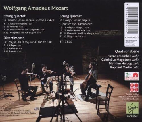 After their multi-award-winning Virgin Classics debut with a CD of Debussy, Ravel and Faur, a program of Brahms, and the pop-jazz collection `Fiction, the members of the bne Quartet turn to works that lie close to the very origins of stringquartet writing - Mozarts so-called `Haydn Quartets. Composed in 1785, the set of six quartets was dedicated by Mozart to his friend and mentor Haydn, the acknowledged `father of the string quartet. The most famous of the set is the quartet in C major, KV 465, the `Dissonance. It opens with a mysterious introduction, with layered harmonies creating the dissonance that gives the quartet its distinctive nickname. It is coupled with the quartet in D minor, KV 421 (another of the `Haydn Quartets) and the Divertimento in F major KV 138, written when Mozart was a teenager. Pierre Colombet, first violin of the bne Quartet explains the ensembles approach to Mozart: "We felt that, after Fiction, it would be a good idea to choose something really very classical, essential quartet music which went back to the roots of the quartet. It is such amazing music, so rich and filled with such subtlety; completely unpretentious, yet of such genius."Additional Info: This release contains 19 songs by Spanish musician, Joaquin Sabina.