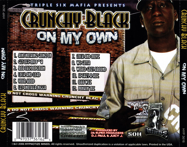 As an original Three 6 Mafia group member along with Lord Infamous, DJ Paul and Juicy J, Crunchy Black played a significant role in the groups albums as an MC, as well as their 2006 Oscar for Best Song. In May, Crunchy and Three 6 Mafia parted ways in a less than friendly manner. This has increased interest in Crunchy Blacks first solo album, which features the entire Hypnotize Minds Posse.