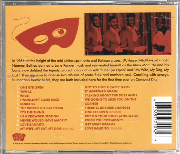 In 1964, at the height of the mid-sixties spy movie and Batman crazes, DC-based R&B/Gospel singer Harmon Bethea donned a Lone Ranger mask and reinvented himself as the Mask Man. He and his band, now dubbed The Agents, scored national hits with "One Eye Open" and "My Wife, My Dog, My Cat". They went on to release two albums of pro to-funk and northern soul. Crackling with energy, humor and frantic beats, they are both included here for the first time ever on Compact Disc!Additional Info: Liner Note Author: James Burston.