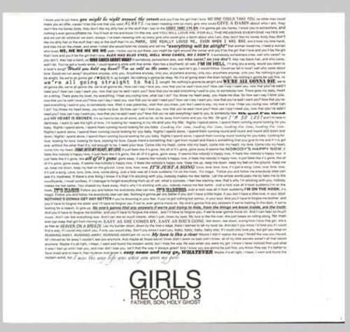 Additional Info: Girls' second full-length sees indie rock songwriter Christopher Owens and his multi-instrumental sidekick Chet "JR" White getting better acquainted with the studio and growing more indulgent. All too often, artists follow up a breakout debut with a difficult sophomore outing, and Girls fall prey to the syndrome, overcompensating for average songs with dazzling instrumentation. It's probable that after recording a straight-ahead EP, they wanted to show off their range, and as a sprawling, 54-minute epic, Father, Son, Holy Ghost is decidedly vast, but it also goes completely over the top. "Alex," "Saying I Love You," and "Forgiveness" fit with the `50s/Americana vibe of the Broken Dreams Club set. "Die" sounds like a stoner rock version of Deep Purple's "Highway Star" before it gives way into a Pink Floyd outro. The dreamy organ ballads "My Ma" and "Vomit" take the Floyd craftsmanship to the next level with a questionable addition of soul singers. Elsewhere, flamenco guitar, Mellotron arrangements, and sweeping guitar harmonies shape simple Merseybeat and soft rock templates into majestic psych-prog-tinged rock numbers. If there is a unifying theme, it's that many of the songs start slow and escalate into overblown jams, with extra session musicians filling the gaps. As a duo, Girls felt comfortable like an old, weathered T-shirt, and now they feel like a well-pressed dress shirt with extra starch. The good news is that this album proves they are top-level purveyors of pop. The bad is that the eccentricity that once flowed freely feels forced. ~ Jason Lymangrover