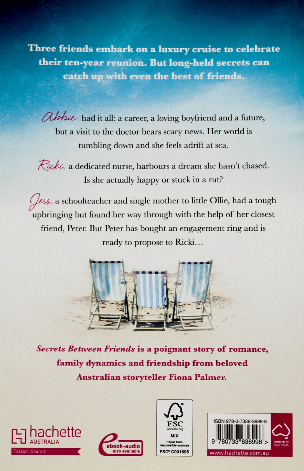 Life was about living, experiencing and emotions. The good and the bad. You had to laugh to cry. You had to love to hurt. You had to jump to fall or fly. Best friends Abbie, Jess and Ricki are setting sail on a cruise ship, rekindling the excitement of a school excursion they took ten years earlier to the historic port town of Albany, the oldest city on the stunning turquoise coastline of Western Australia. But are they truly prepared for what this voyage will reveal? Ricki, a dedicated nurse, harbours a dream she hasn't chased. Is she actually happy or stuck in a rut? Jess, a school teacher and single mother to little Ollie, had a tough upbringing but found her way through with the help of her closest male friend, Peter. But Peter has bought an engagement ring and is ready to propose to Ricki ...Abbie had it all: a career, a loving boyfriend and a future, but a visit to the doctor bears scary news. Her world is tumbling down and she feels adrift at sea. SECRETS BETWEEN FRIENDS is a poignant novel of romance, family dynamics and friendship. Through her highly relatable, sympathetic characters, beloved Australian storyteller Fiona Palmer writes about issues, experiences and emotions we have all faced while posing the ultimate question: What is really important in this life?