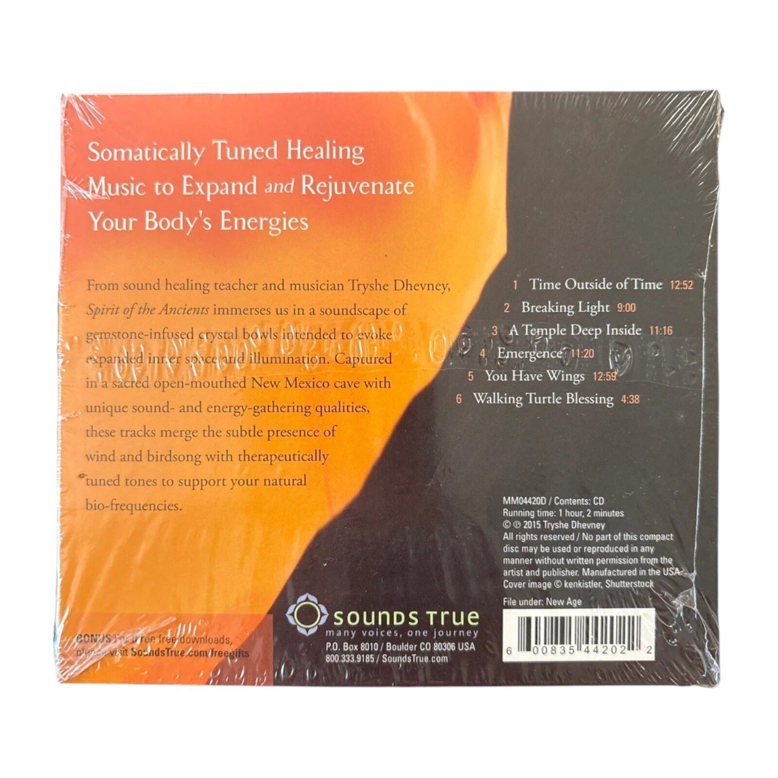 From sound healing teacher and musician Tryshe Dhevney, Spirit of the Ancients immerses us in a soundscape of gemstone-infused crystal bowls intended to evoke expanded inner space and illumination. Captured in a sacred open-mouthed New Mexico cave with unique sound- and energy-gathering qualities, these tracks merge the subtle presence of wind and birdsong with therapeutically tuned tones to support your natural bio-frequencies. Upon first listening to Tryshe Dhevneys recordings, many report an immediate and profound sense of rejuvenation and expanded awareness. Recommended for use by bodyworkers, energy healers, meditators, or anyone looking for an uplifting listening experience. Sound healer and music artist Tryshe Dhevneys encore to her acclaimed album Crystal Bowl Sound Healing. Tryshe Dhevney is a recording artist, authority in the field of vocal sound healing, and author of SOUNDShifting: Your Personal Guide to Self-Healing with Sound. She teaches at Canyon Ranch in Tucson, Arizona, and in workshops across the country. For more, visit soundshifting. ITEM#: 17220898\nFrom sound healing teacher and musician Tryshe Dhevney, Spirit of the Ancients immerses us in a soundscape of gemstone-infused crystal bowls intended to evoke expanded inner space and illumination. Captured in a sacred open-mouthed New Mexico cave with unique sound- and energy-gathering qualities, these tracks merge the subtle presence of wind and birdsong with therapeutically tuned tones to support your natural bio-frequencies. Upon first listening to Tryshe Dhevney's recordings, many report an immediate and profound sense of rejuvenation and expanded awareness. Recommended for use by bodyworkers, energy healers, meditators, or anyone looking for an uplifting listening experience. Sound healer and music artist Tryshe Dhevney's encore to her acclaimed album Crystal Bowl Sound Healing. Tryshe Dhevney is a recording artist, authority in the field of vocal sound healing, and author of SOUNDShifting: Your Personal Guide to Self-Healing with Sound. She teaches at Canyon Ranch in Tucson, Arizona, and in workshops across the country.\n- \n