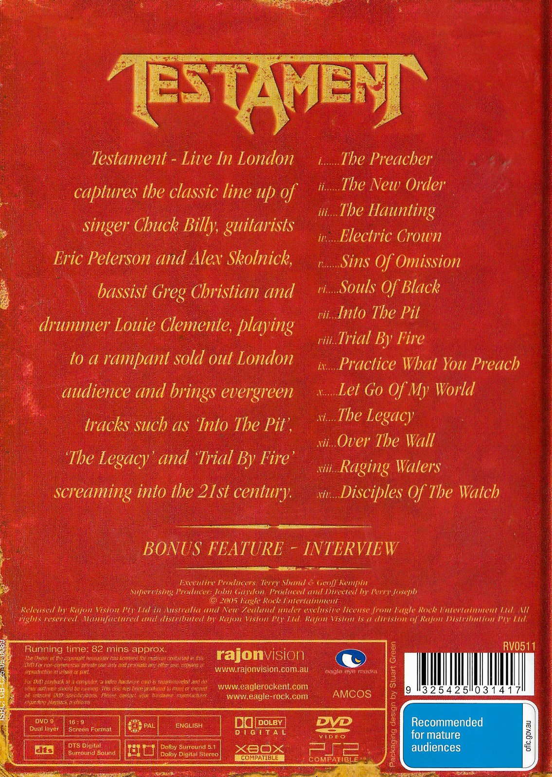 Among the leaders of heavy metal over the past twenty years, Testament have always provided the rock solid proof that great song writing, regardless of genre, will always transcend time. Their crucial contributions to the early thrash metal surge of the mid to late 1980s helped to develop a sound that forever changed the face of heavy music and resonates just as loudly today. With all of their Bay Area peers either calling it a day or drastically altering their sound, Testament has remained a worldwide metal ambassador throughout the 1990s and into the new century.Testament-Live In London captures the recently reunited classic line up of singer Chuck Billy, guitarists Eric Peterson and Alex Skolnick, bassist Greg Christian and drummer Louie Clemonte playing to a rampant sold out London audience. Bringin evergreen tracks such as Into The Pit, The Legacy and Trial By Fire screaming into the 21st century.