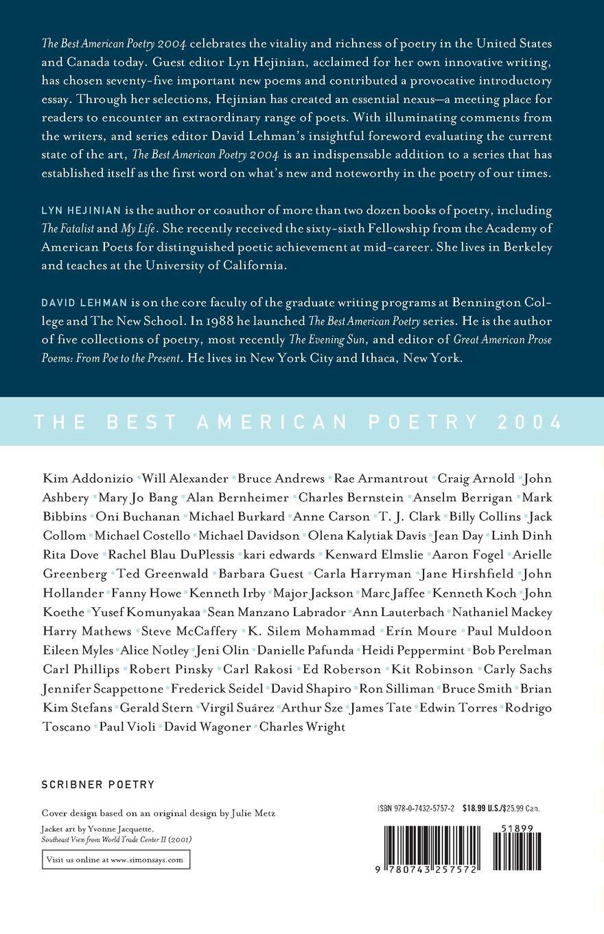 Author: Hejinian, Lyn,Lehman, DavidPublisher: Simon & SchusterCategory: Poetry By Individual Poets, Poetry Anthologies (various Poets), Contemporary FictionAge Group: 15+Book Format: PaperbackThe Best American Poetry 2004 celebrates the vitality and richness of poetry in the United States and Canada today. Guest editor Lyn Hejinian, acclaimed for her own innovative writing, has chosen seventy-five important new poems and contributed a provocative introductory essay. Through her selections, Hejinian has created an essential nexus -- a meeting place for readers to encounter an extraordinary range of poets. With illuminating comments from the writers, and series editor David Lehman's insightful foreword evaluating the current state of the art, The Best American Poetry 2004 is an indispensable addition to a series that has established itself as the first word on what's new and noteworthy in the poetry of our times.