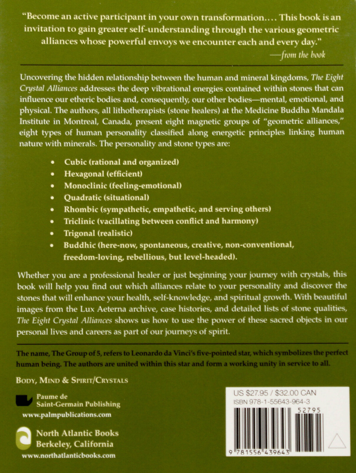 Author: Group of 5Publisher: North Atlantic BooksCategory: Assertiveness, Motivation & Self-esteem, Mind, Body, Spirit: Thought & Practice, Crystals & Colour-healingBook Format: PaperbackDespite the diversity of theories of human psychology, the majority shares a view of the personality as a collection of traits, ways of thinking and acting, that allow the observer to define, recognize, and understand people and their motivations. The Eight Crystal Alliances takes a more inclusive, holistic approach toward a personality typology that incorporates the physical body, the thoughts, the emotions, and the soul.