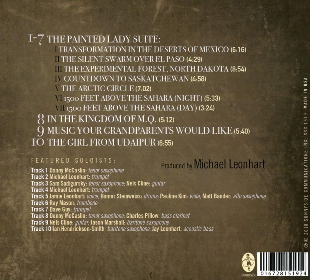 . The Painted Lady Suite 1. Transformation In The Deserts Of Mexico Soloist, Tenor Saxophone – Donny McCaslin Soloist, Tenor Saxophone – Donny McCaslin 2. The Silent Swarm Over El Paso Soloist, Trumpet – Michael Leonhart Soloist, Trumpet – Michael Leonhart 3. The Experimental Forest, North Dakota Soloist, Tenor Saxophone – Sam Sadigursky Soloist, Guitar – Nels Cline Soloist, Tenor Saxophone – Sam Sadigursky Soloist, Guitar – Nels Cline 4. Countdown To Saskatchewan Soloist, Trumpet – Michael Leonhart Soloist, Trumpet – Michael Leonhart 5. The Arctic Circle Soloist, Voice – Jamie Leonhart Soloist, Drums – Homer Steinweiss Soloist, Viola – Pauline Kim Soloist, Alto Saxophone – Matt Bauder Soloist, Voice – Jamie Leonhart Soloist, Drums – Homer Steinweiss Soloist, Viola – Pauline Kim Soloist, Alto Saxophone – Matt Bauder 6. 1500 Feet Above The Sahara (Night) Soloist, Trombone – Ray Mason (3) Soloist, Trombone – Ray Mason (3) 7. 1500 Feet Above The Sahara (Day) Soloist, Trumpet – Dave Guy Soloist, Trumpet – Dave Guy 8. In The Kingdom Of M.Q. Soloist, Bass Clarinet – Charles Pillow Soloist, Tenor Saxophone – Donny McCaslin Soloist, Bass Clarinet – Charles Pillow Soloist, Tenor Saxophone – Donny McCaslin 9. Music Your Grandparents Would Like Soloist, Baritone Saxophone – Jason Marshall Soloist, Guitar – Nels Cline Soloist, Baritone Saxophone – Jason Marshall Soloist, Guitar – Nels Cline 10. The Girl From Udaipur Soloist, Acoustic Bass – Jay Leonhart Soloist, Baritone Saxophone – Ian Hendrickson-Smith Soloist, Acoustic Bass – Jay Leonhart Soloist, Baritone Saxophone – Ian Hendrickson-Smith