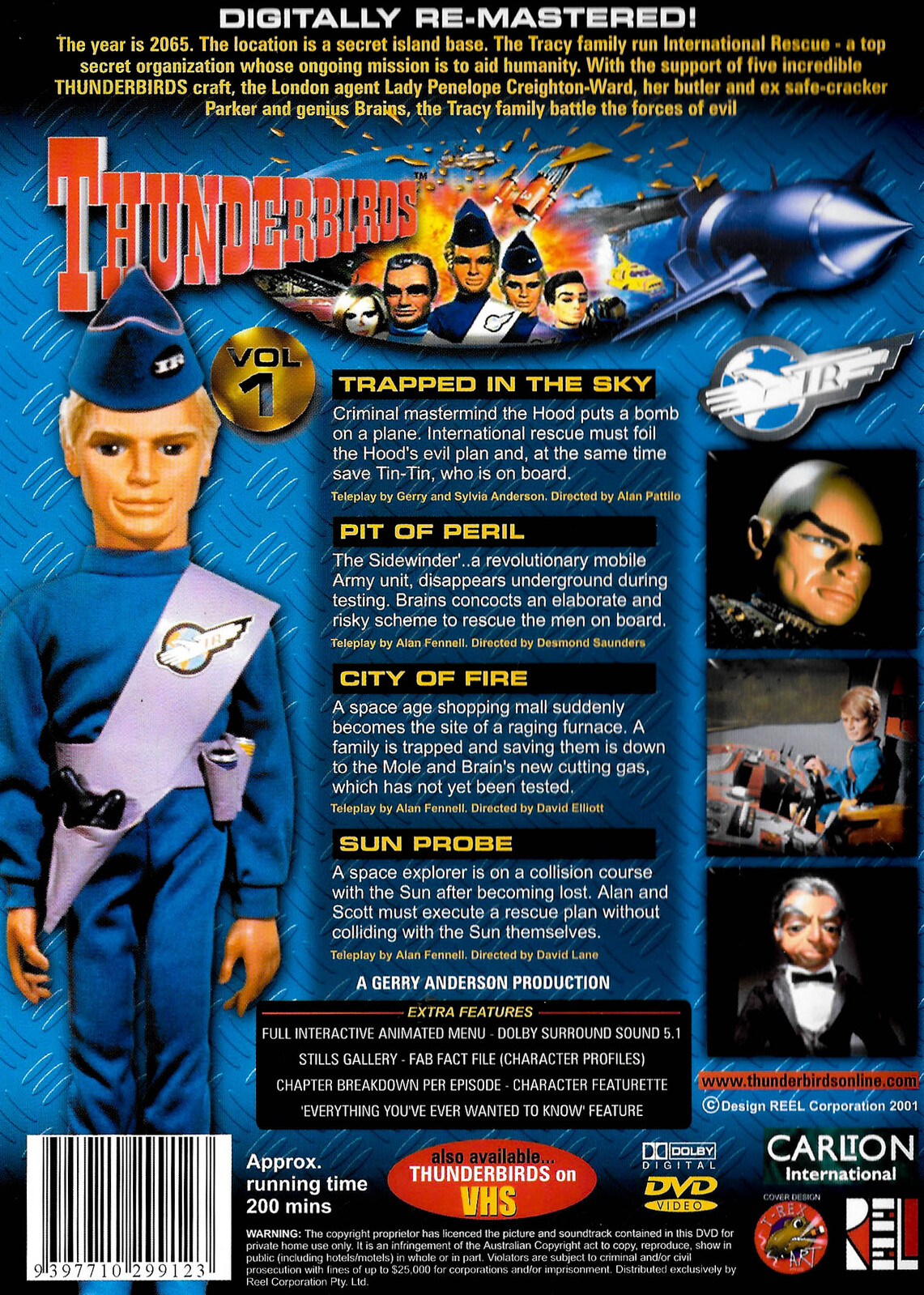 The year is 2065. The location is a secret island base. The Tracy family run International Rescue - a top secret organization whose ongoing mission is to aid humanity. With the support of five incredible THUNDERBIRDS craft, the London agent Lady Penelope Creighton-Ward, her butler and ex safe-cracker Parker and genius Brains, the Tracy family battle the forces of evil.Trapped In The Sky. Criminal mastermind the Hood puts a bomb on a plane. International rescue must foil the Hood's evil plan and, at the same time save Tin-Tin, who is on board.Pit Of Peril. The 'Sidewinder' .. a revolutionary mobile Army unit, disappears underground during testing. Brains concocts an elaborate and risky scheme to rescue the men on board.City Of Fire. A space age shopping mall suddenly becomes the site of a raging furnace. A family is trapped and saving them is down to the Mole and Brain's new cutting gas, which has not yet been tested. Sun Probe. A space explorer is on a collision course with the Sun after becoming lost. Alan and Scott must execute a rescue plan without colliding with the Sun themselves.